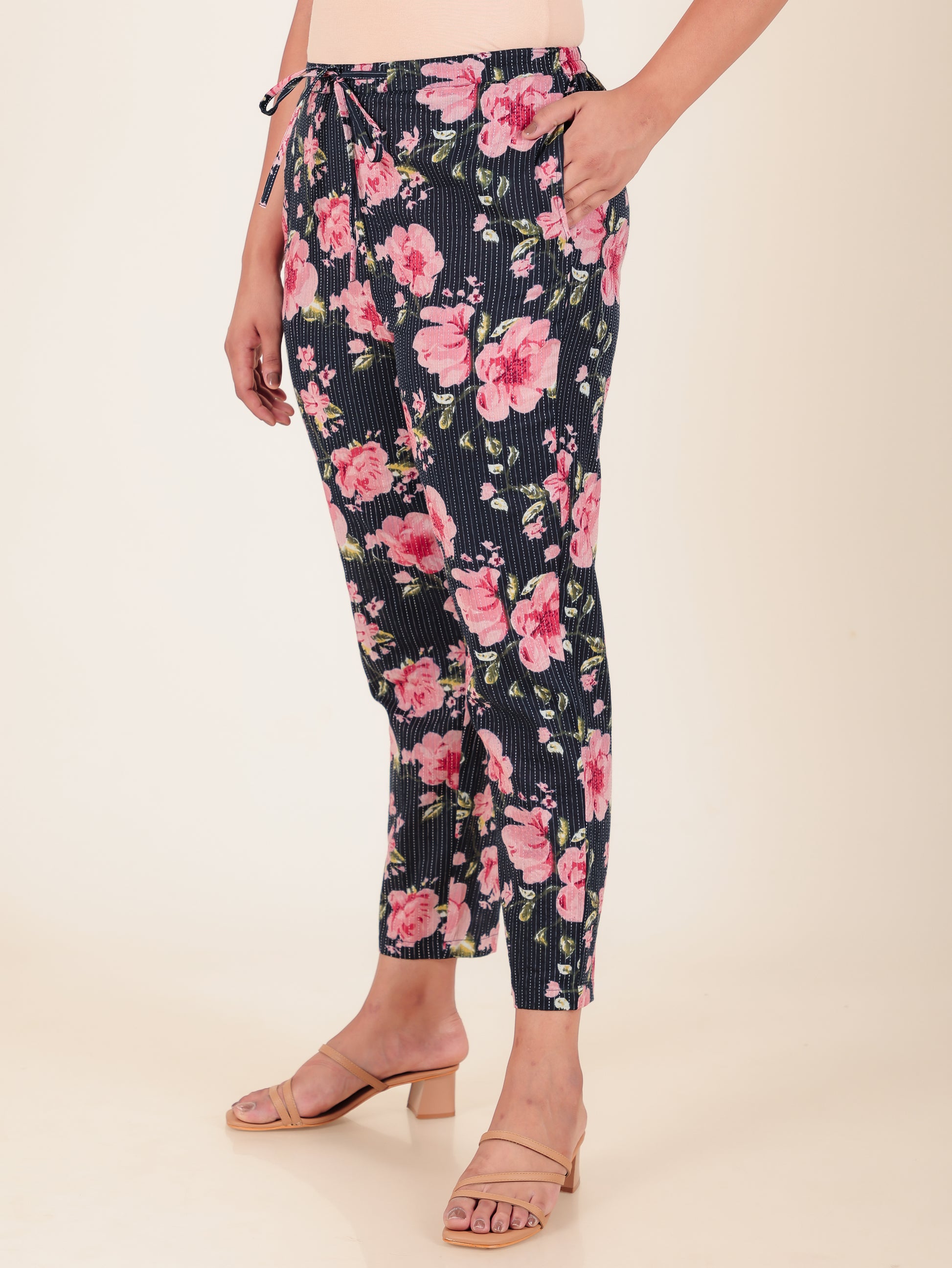 Crafted from Kantha Cotton, these Blue bottoms are designed for all-day comfort. The chic Floral work adds flair, and pockets provide convenience for carrying essentials. Great for casual days, shopping trips, or work, these bottoms pair effortlessly with your favourite tops. Their durable design and easy maintenance make them a practical staple.