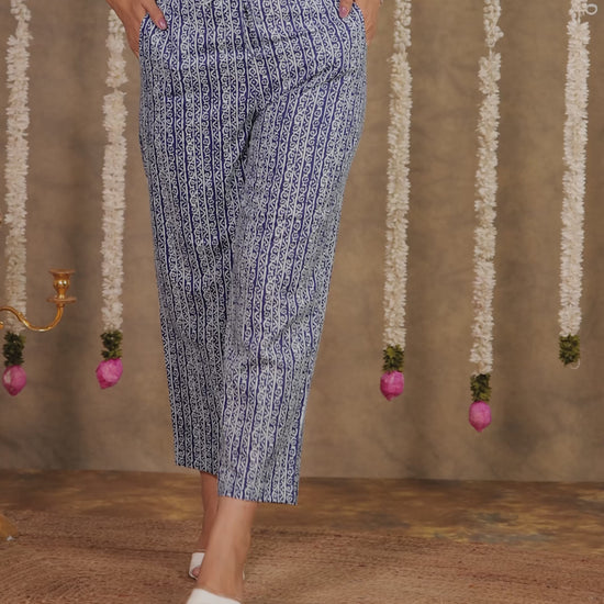 These Blue trouser crafted from breathable Soft Cotton combine comfort and style. The Tribal pattern adds a modern twist, while pockets make them practical for daily wear. Ideal for casual outings or workdays, they pair effortlessly with kurtas, tops, or tunics. Keep them looking fresh with minimal care and enjoy their all-day ease.