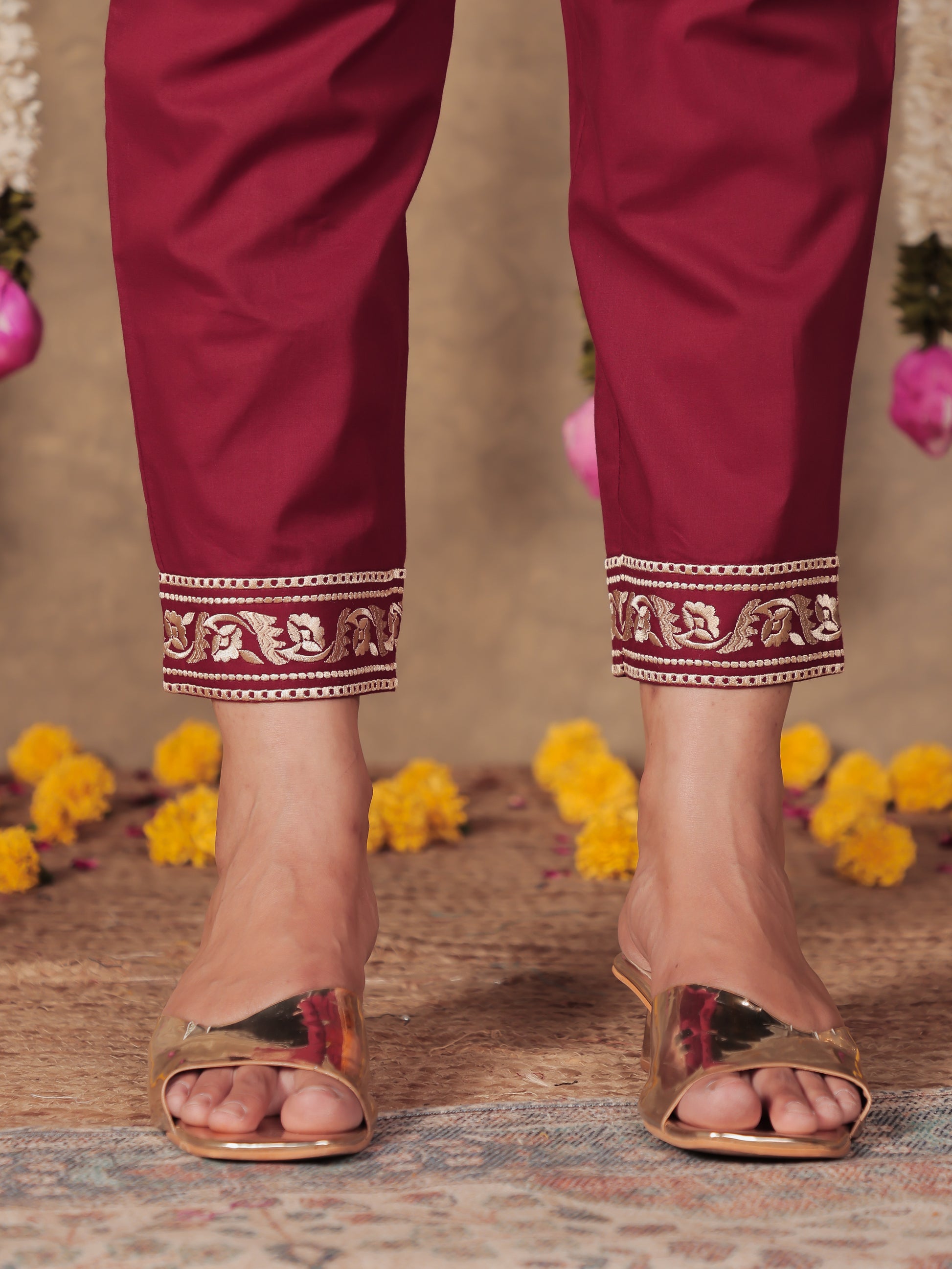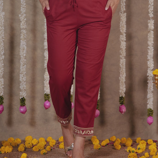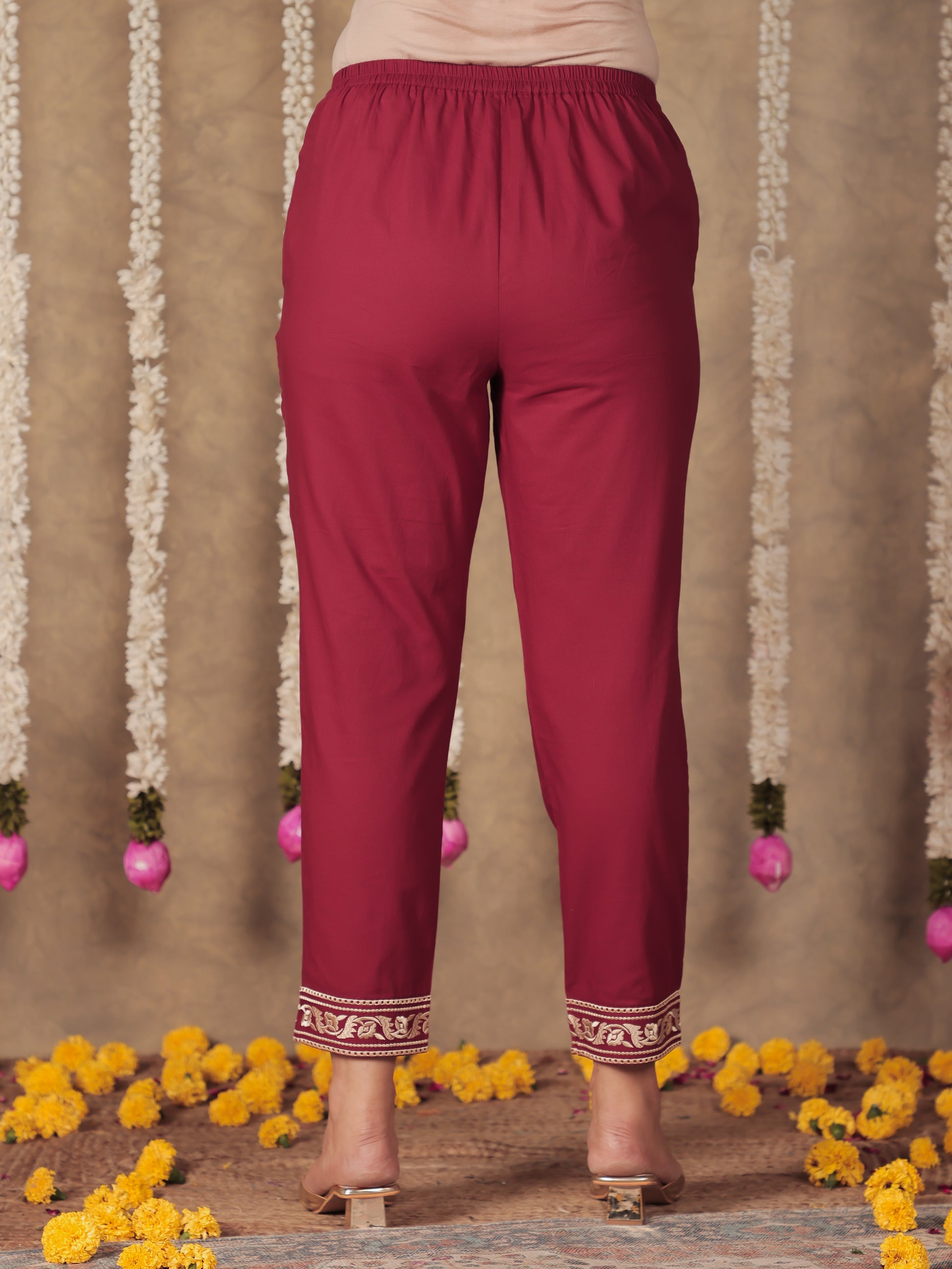 These Maroon trouser crafted from breathable Soft Cotton combine comfort and style. The Solid pattern adds a modern twist, while pockets make them practical for daily wear. Ideal for casual outings or workdays, they pair effortlessly with kurtas, tops, or tunics. Keep them looking fresh with minimal care and enjoy their all-day ease.