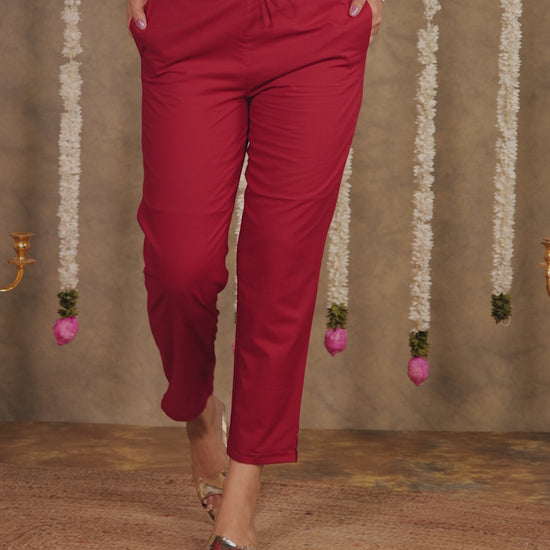 These Maroon trouser crafted from breathable Soft Cotton combine comfort and style. The Solid pattern adds a modern twist, while pockets make them practical for daily wear. Ideal for casual outings or workdays, they pair effortlessly with kurtas, tops, or tunics. Keep them looking fresh with minimal care and enjoy their all-day ease.