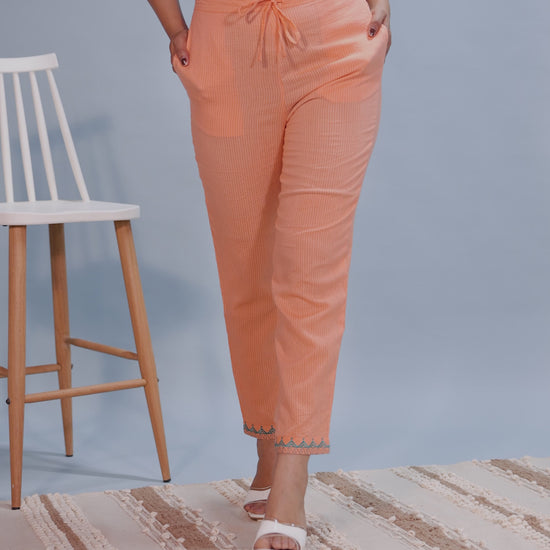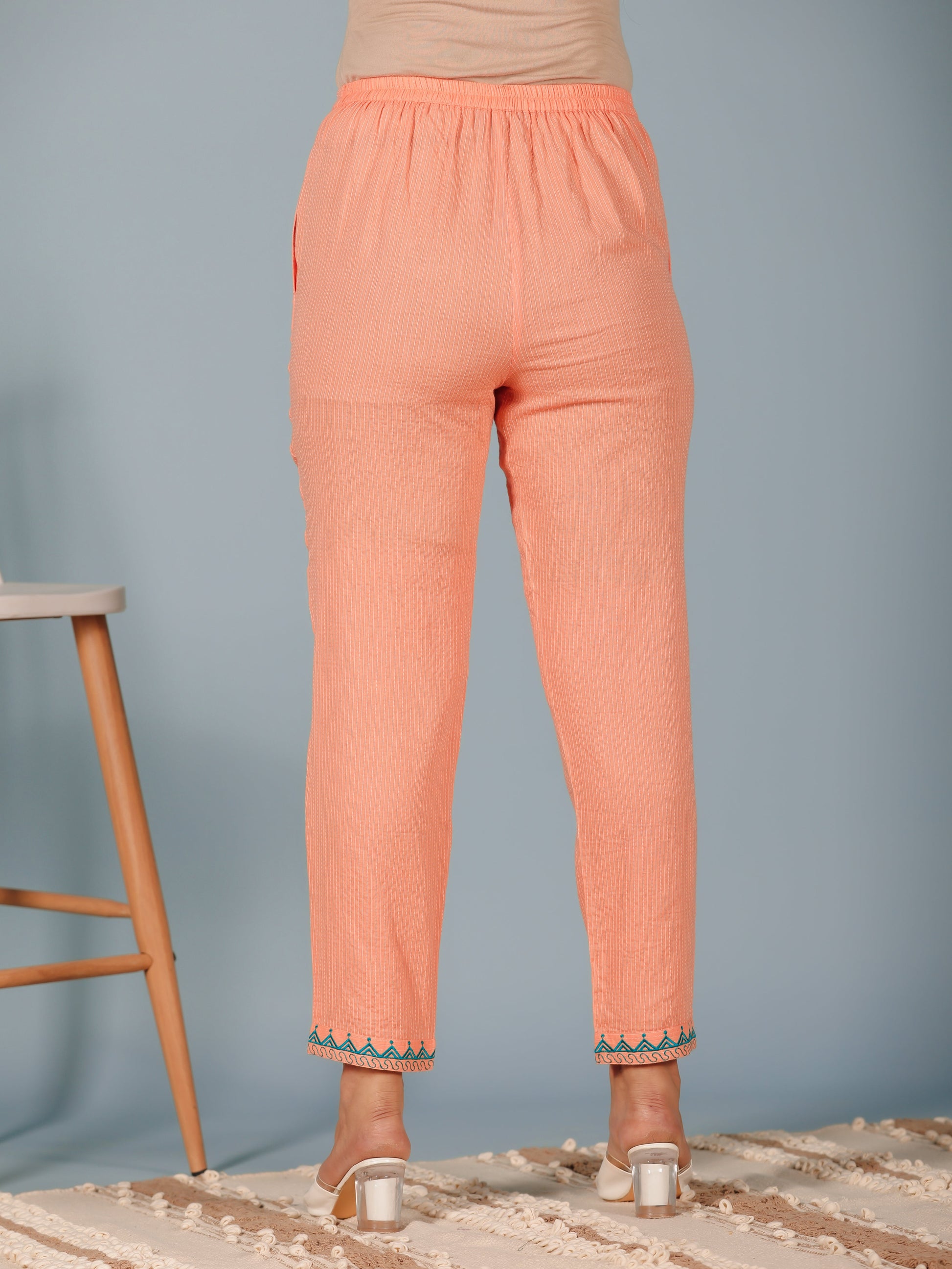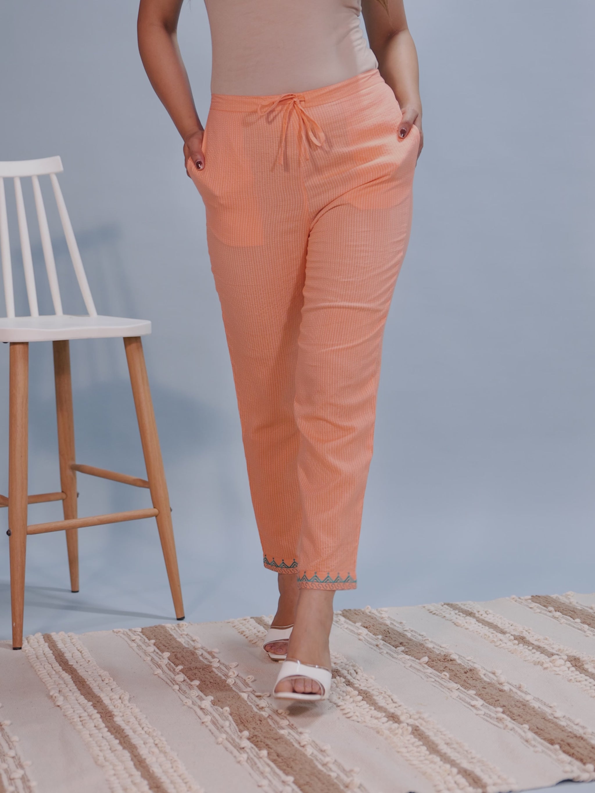 Upgrade your wardrobe with these Orange bottoms made from lightweight Kantha Cotton. The Solid accents bring subtle charm, while pockets make them practical for all-day wear. Perfect for pairing with ethnic kurtas or western blouses, these bottoms are a go-to choice for comfort and style. Easy care ensures they stay fresh season after season.