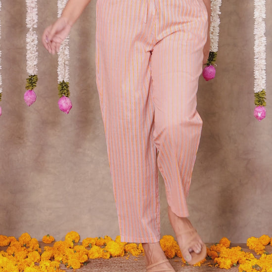 Crafted from Soft Cotton, these Peach bottoms are designed for all-day comfort. The chic Striped work adds flair, and pockets provide convenience for carrying essentials. Great for casual days, shopping trips, or work, these bottoms pair effortlessly with your favourite tops. Their durable design and easy maintenance make them a practical staple.