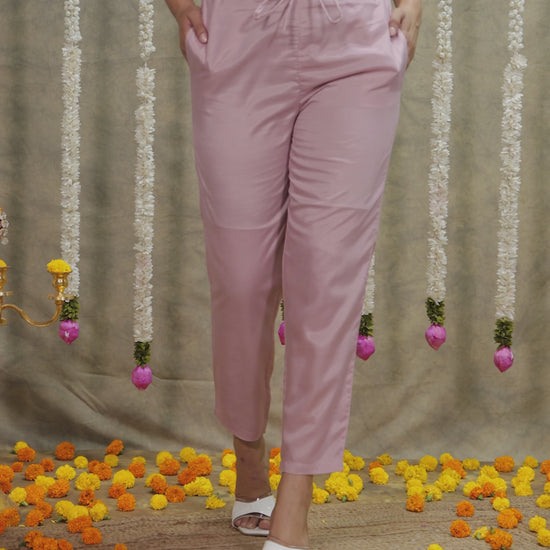 These Pink trouser crafted from breathable Chanderi combine comfort and style. The Solid pattern adds a modern twist, while pockets make them practical for daily wear. Ideal for casual outings or workdays, they pair effortlessly with kurtas, tops, or tunics. Keep them looking fresh with minimal care and enjoy their all-day ease.