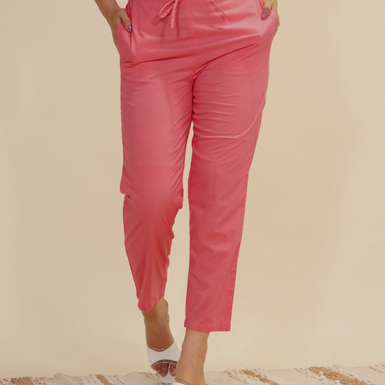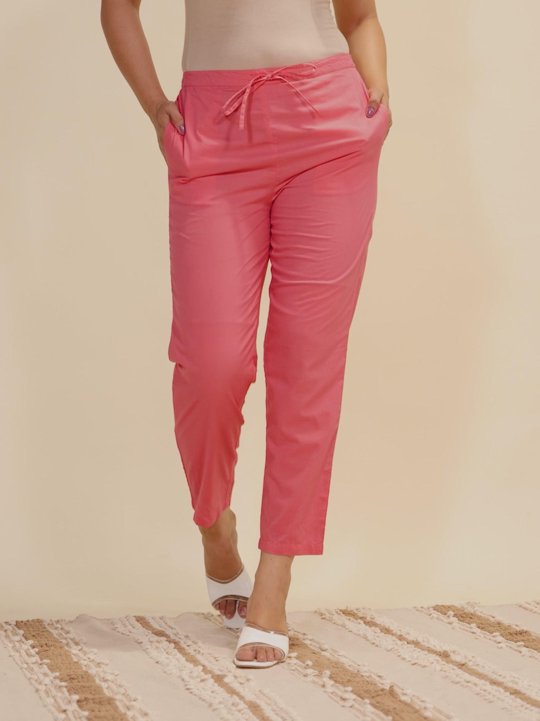 You'll reach for these pink soft cotton pants again and again – they're that good. These essential pants feature a flattering cut that works for any body type. The contemporary ankle length proportion creates a balanced silhouette for various outfit pairings. The practical partially elastic waistband ensures these bottoms stay perfectly in place with ease. Includes dual pockets that provide storage for your everyday necessities. Easy to maintain with machine wash instructions, these bottoms will become a wardrobe staple.