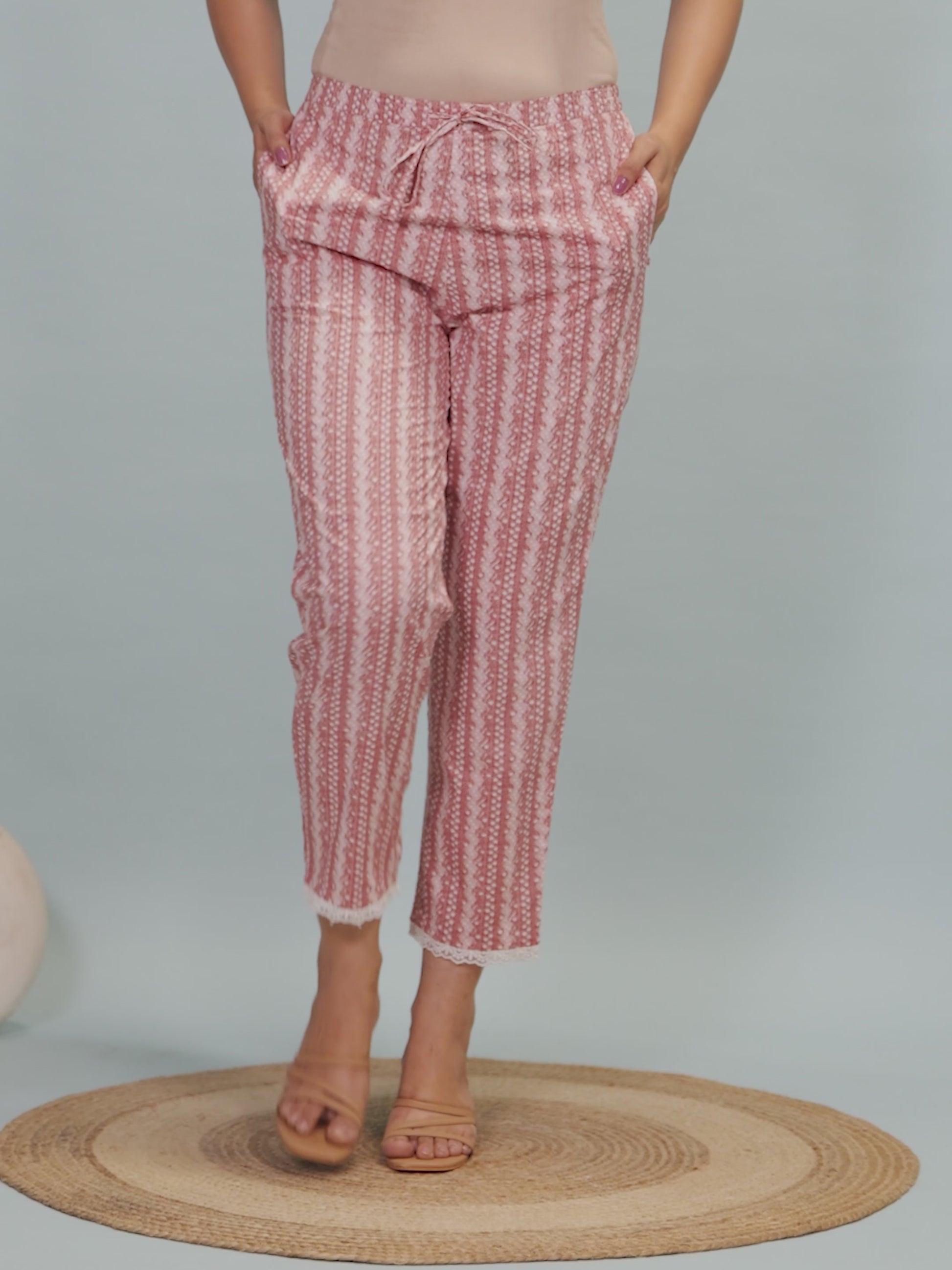 These Pink trouser crafted from breathable Soft Cotton combine comfort and style. The Striped pattern adds a modern twist, while pockets make them practical for daily wear. Ideal for casual outings or workdays, they pair effortlessly with kurtas, tops, or tunics. Keep them looking fresh with minimal care and enjoy their all-day ease.