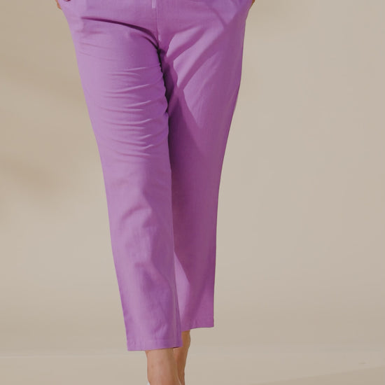 These Purple trouser crafted from breathable Linen Cotton combine comfort and style. The Solid pattern adds a modern twist, while pockets make them practical for daily wear. Ideal for casual outings or workdays, they pair effortlessly with kurtas, tops, or tunics. Keep them looking fresh with minimal care and enjoy their all-day ease.