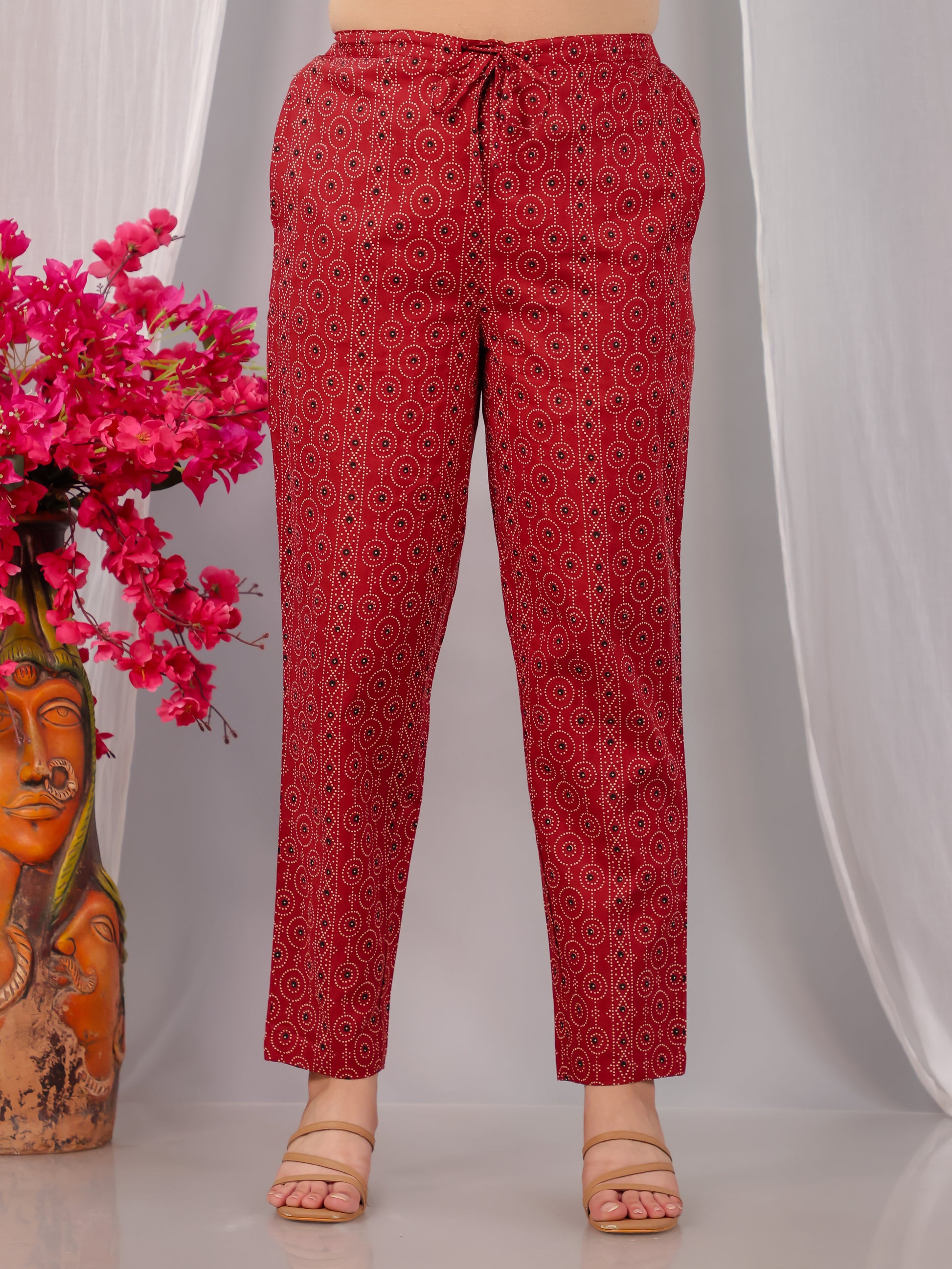 Upgrade your wardrobe with these Red bottoms made from lightweight Soft Cotton. The Geometric accents bring subtle charm, while pockets make them practical for all-day wear. Perfect for pairing with ethnic kurtas or western blouses, these bottoms are a go-to choice for comfort and style. Easy care ensures they stay fresh season after season.