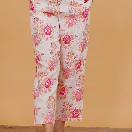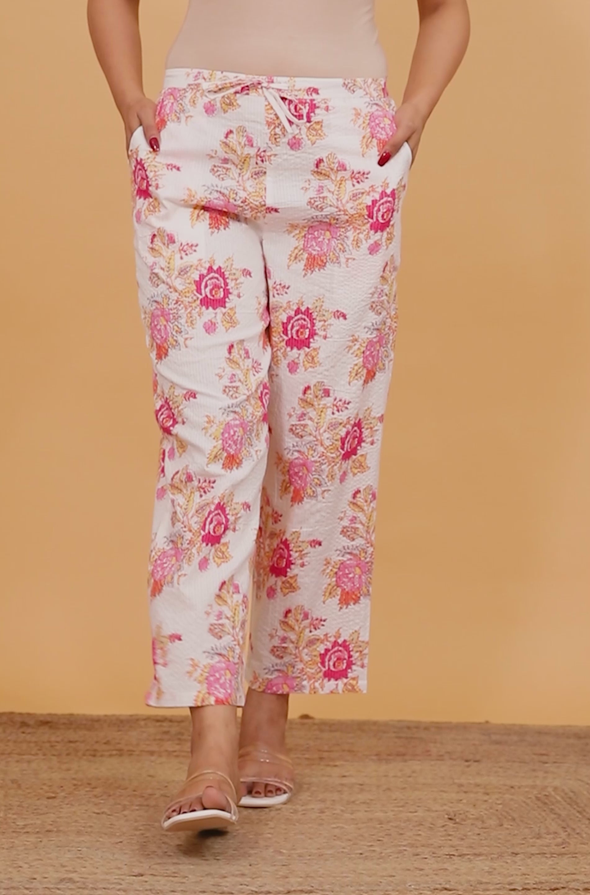 These White trouser crafted from breathable Kantha Cotton combine comfort and style. The Floral pattern adds a modern twist, while pockets make them practical for daily wear. Ideal for casual outings or workdays, they pair effortlessly with kurtas, tops, or tunics. Keep them looking fresh with minimal care and enjoy their all-day ease.