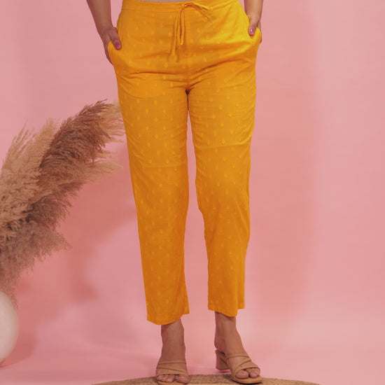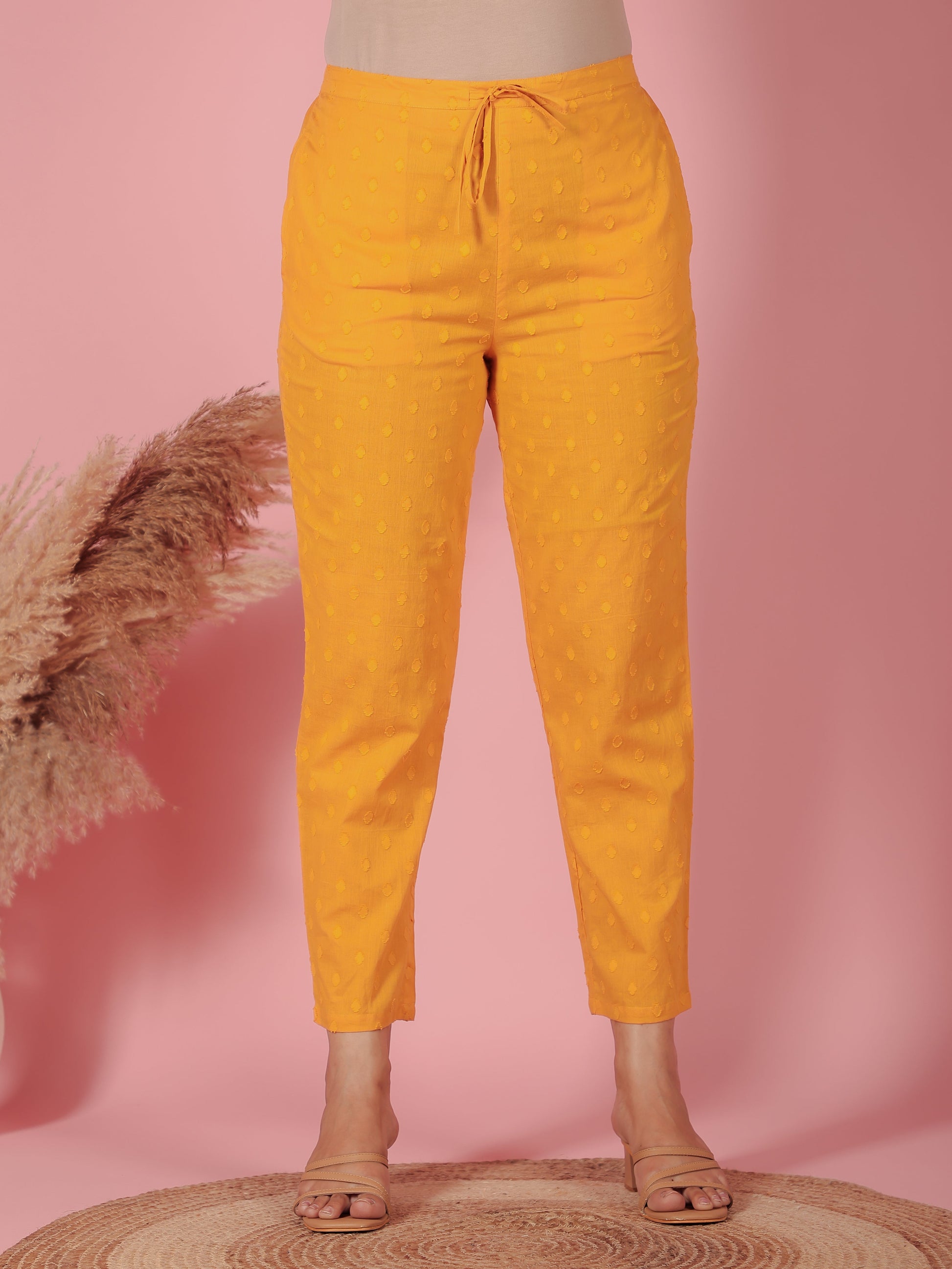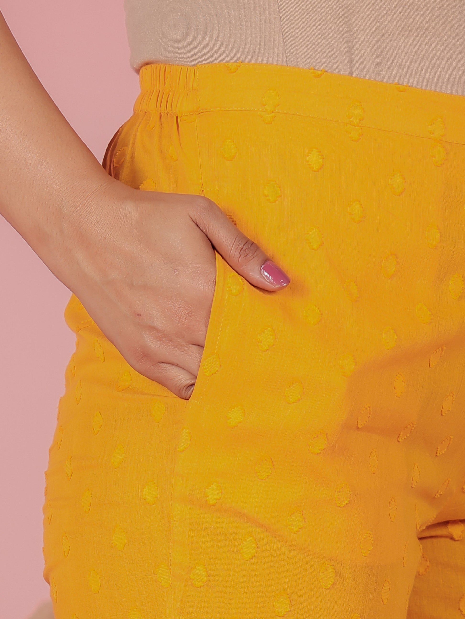 Upgrade your wardrobe with these Yellow bottoms made from lightweight Textured Cotton. The Solid accents bring subtle charm, while pockets make them practical for all-day wear. Perfect for pairing with ethnic kurtas or western blouses, these bottoms are a go-to choice for comfort and style. Easy care ensures they stay fresh season after season.