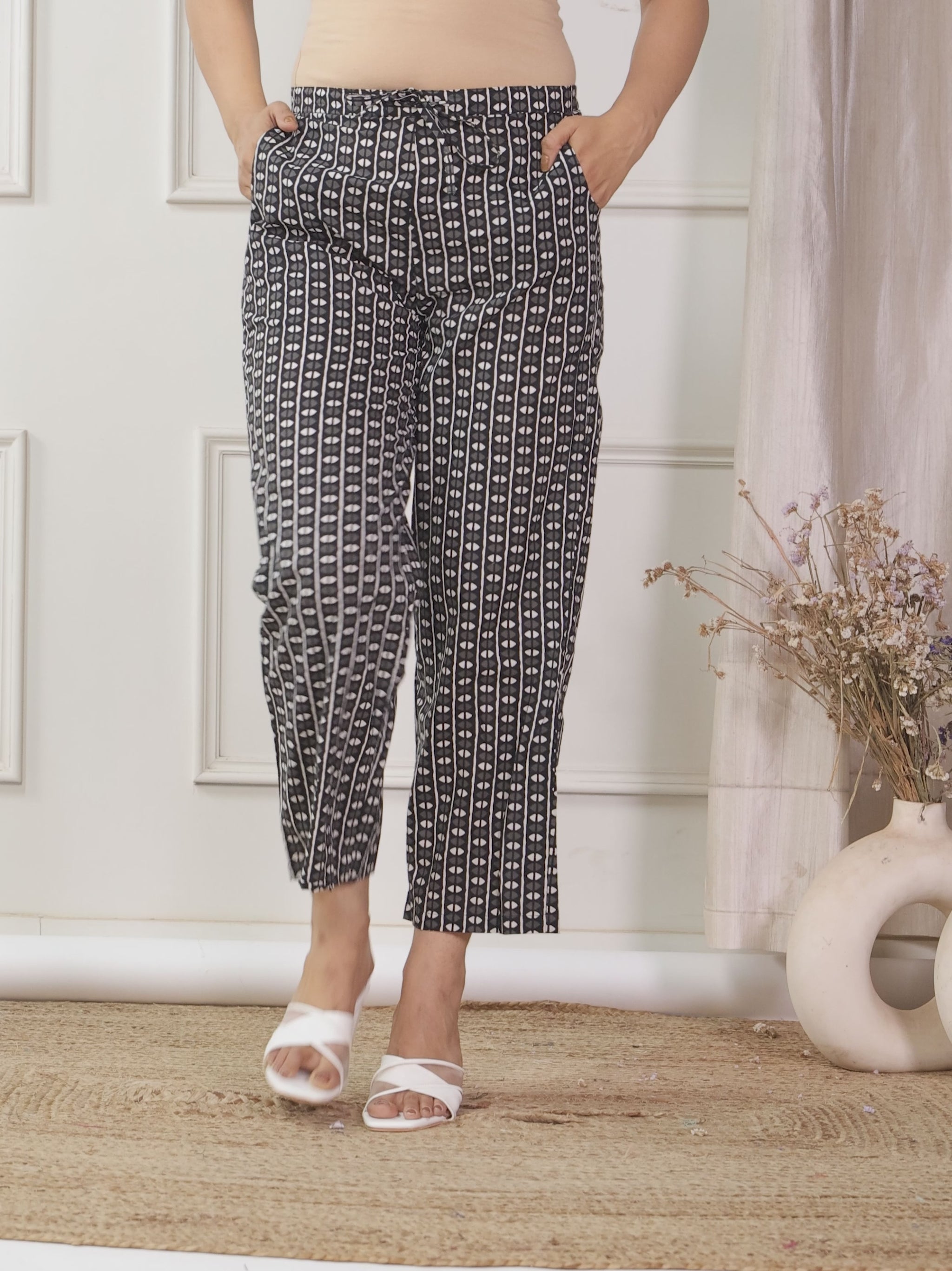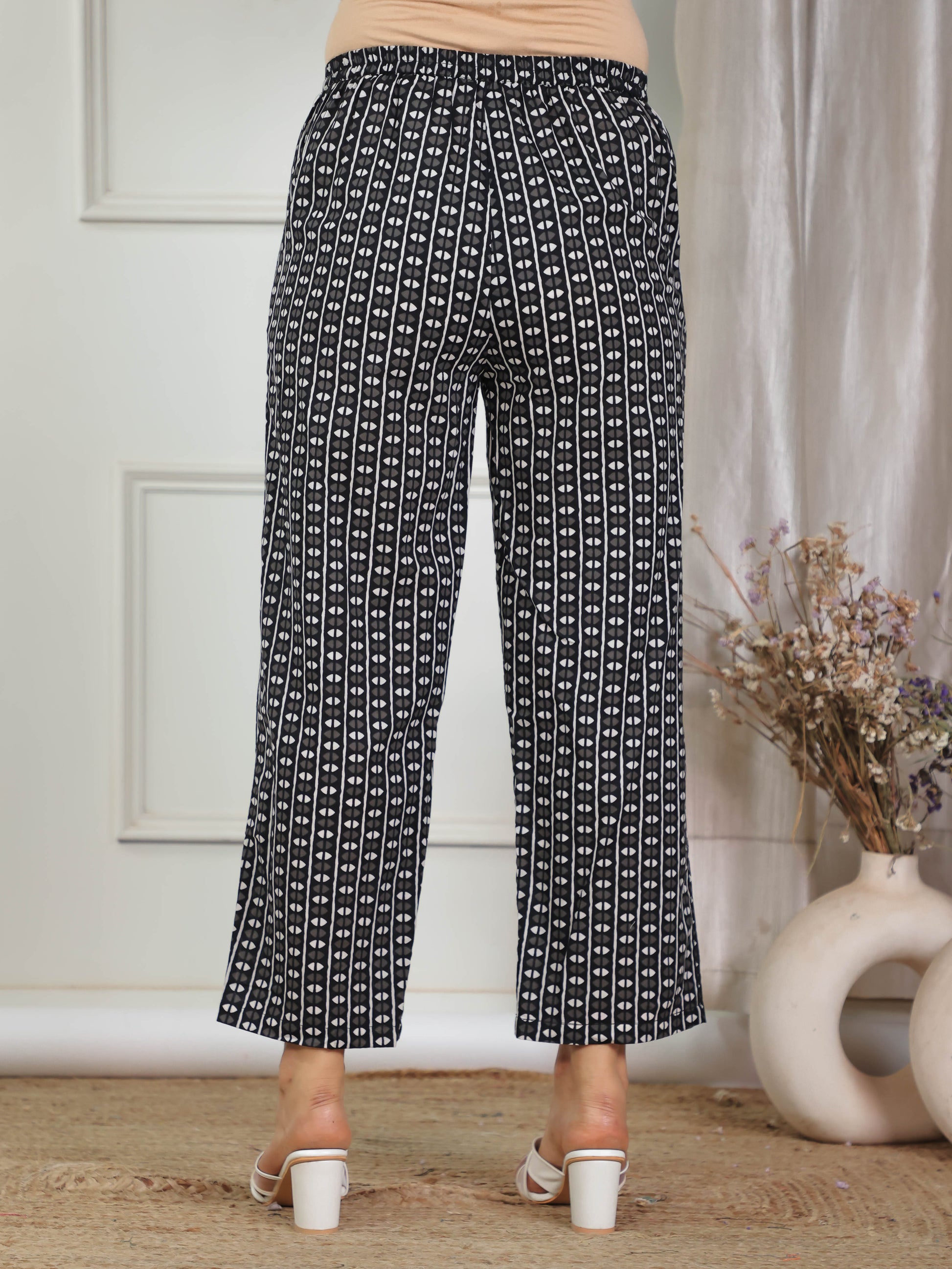 These Black trouser crafted from breathable Soft Cotton combine comfort and style. The Tribal pattern adds a modern twist, while pockets make them practical for daily wear. Ideal for casual outings or workdays, they pair effortlessly with kurtas, tops, or tunics. Keep them looking fresh with minimal care and enjoy their all-day ease.