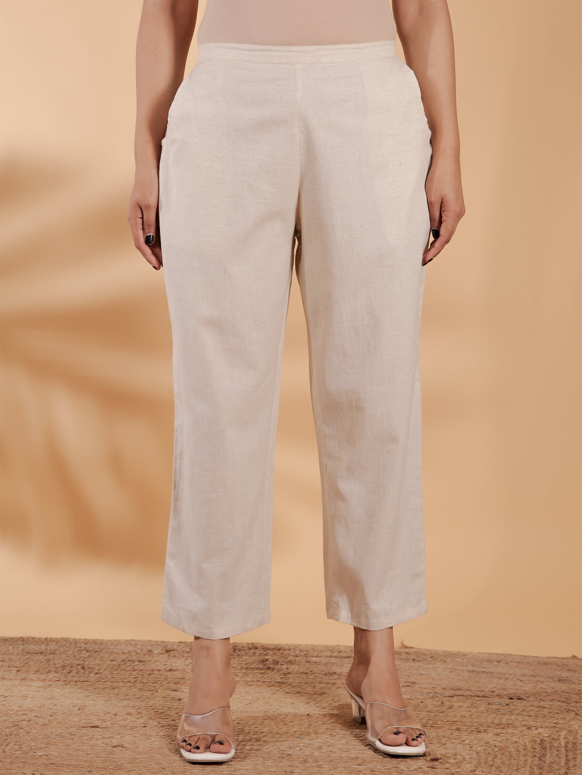 Designed for both comfort and versatility, these Linen Cotton Cream bottoms feature a stylish Solid design and pockets for added functionality. Perfect for office looks or weekend errands, they offer a flattering fit that works with a variety of tops. Pair with minimal accessories for a polished finish and enjoy effortless care.