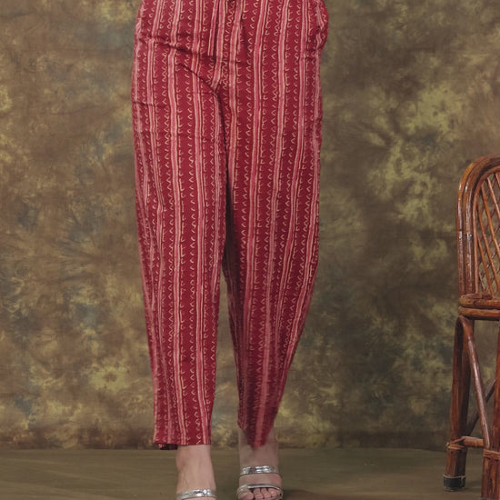 These Maroon trouser crafted from breathable Soft Cotton combine comfort and style. The Tribal pattern adds a modern twist, while pockets make them practical for daily wear. Ideal for casual outings or workdays, they pair effortlessly with kurtas, tops, or tunics. Keep them looking fresh with minimal care and enjoy their all-day ease.
