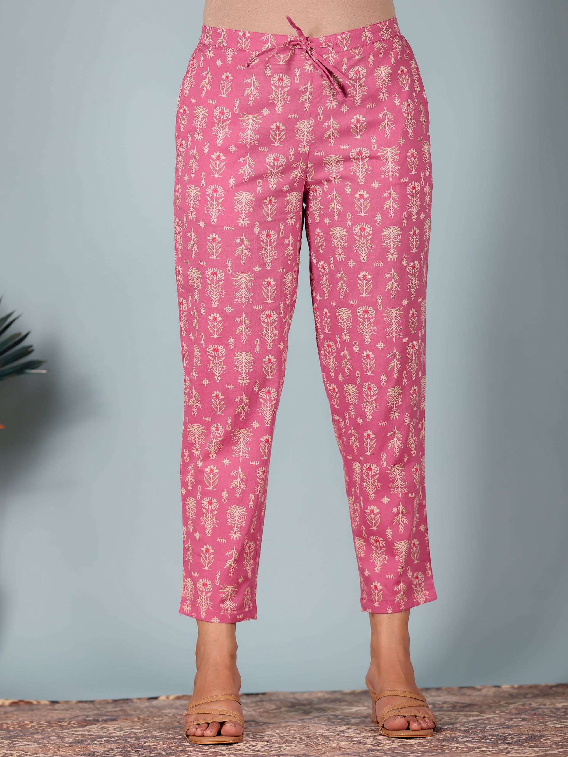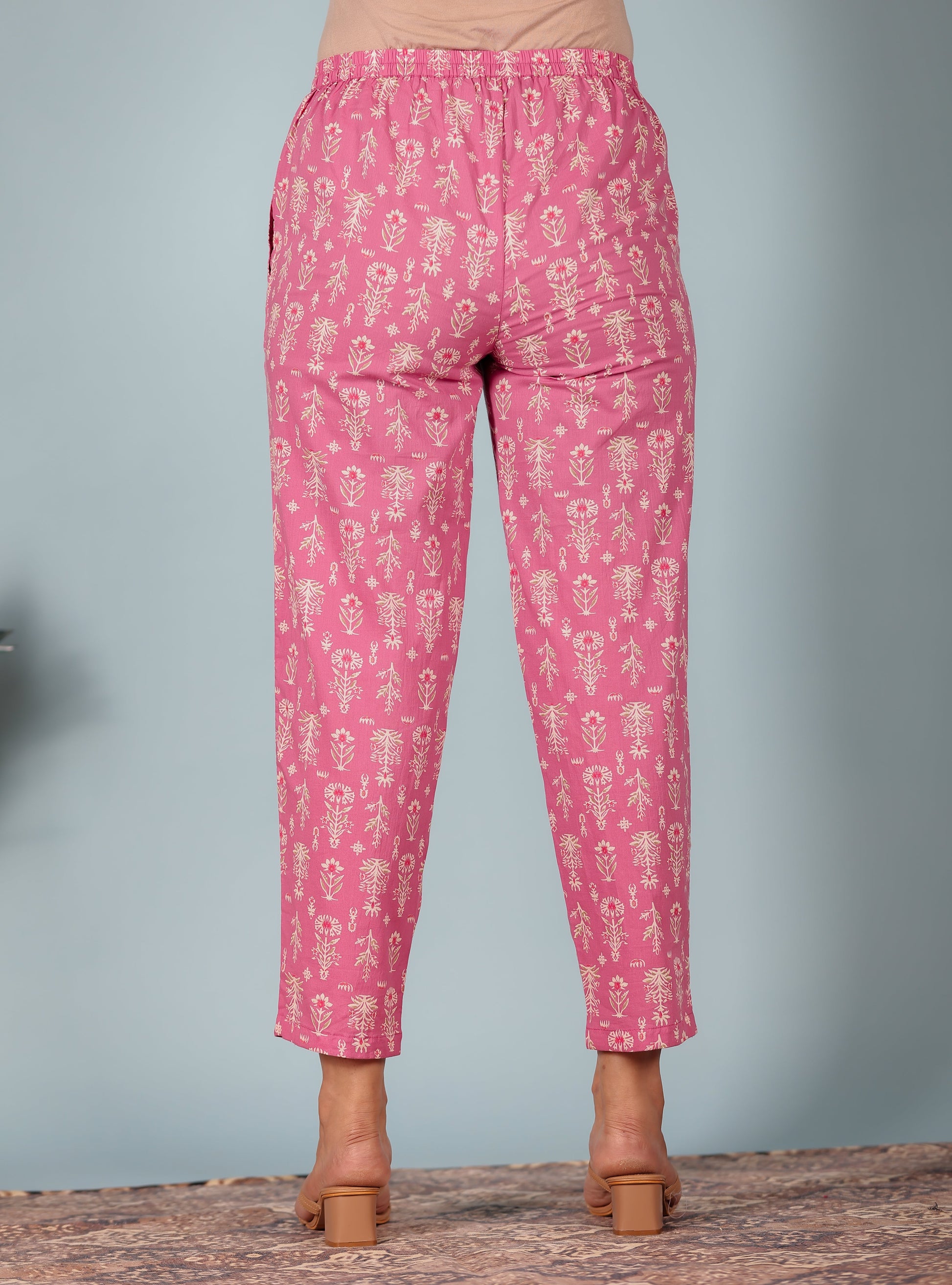 Upgrade your wardrobe with these Pink bottoms made from lightweight Soft Cotton. The Floral accents bring subtle charm, while pockets make them practical for all-day wear. Perfect for pairing with ethnic kurtas or western blouses, these bottoms are a go-to choice for comfort and style. Easy care ensures they stay fresh season after season.