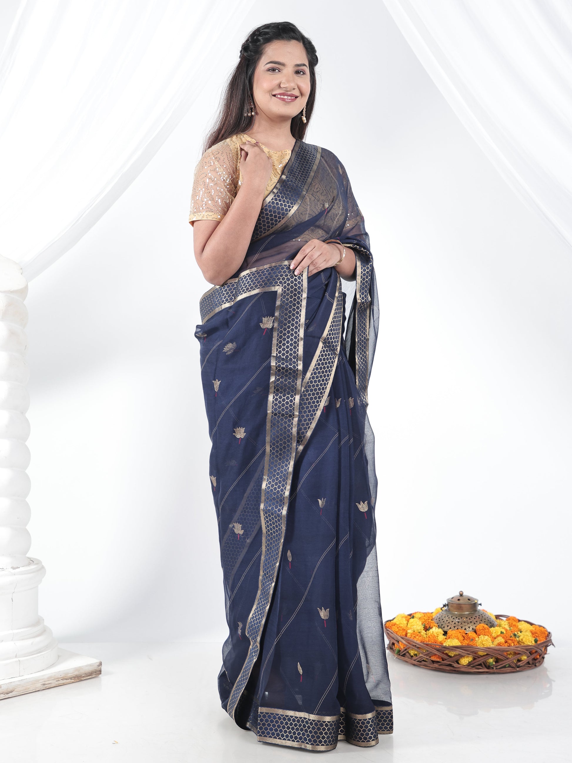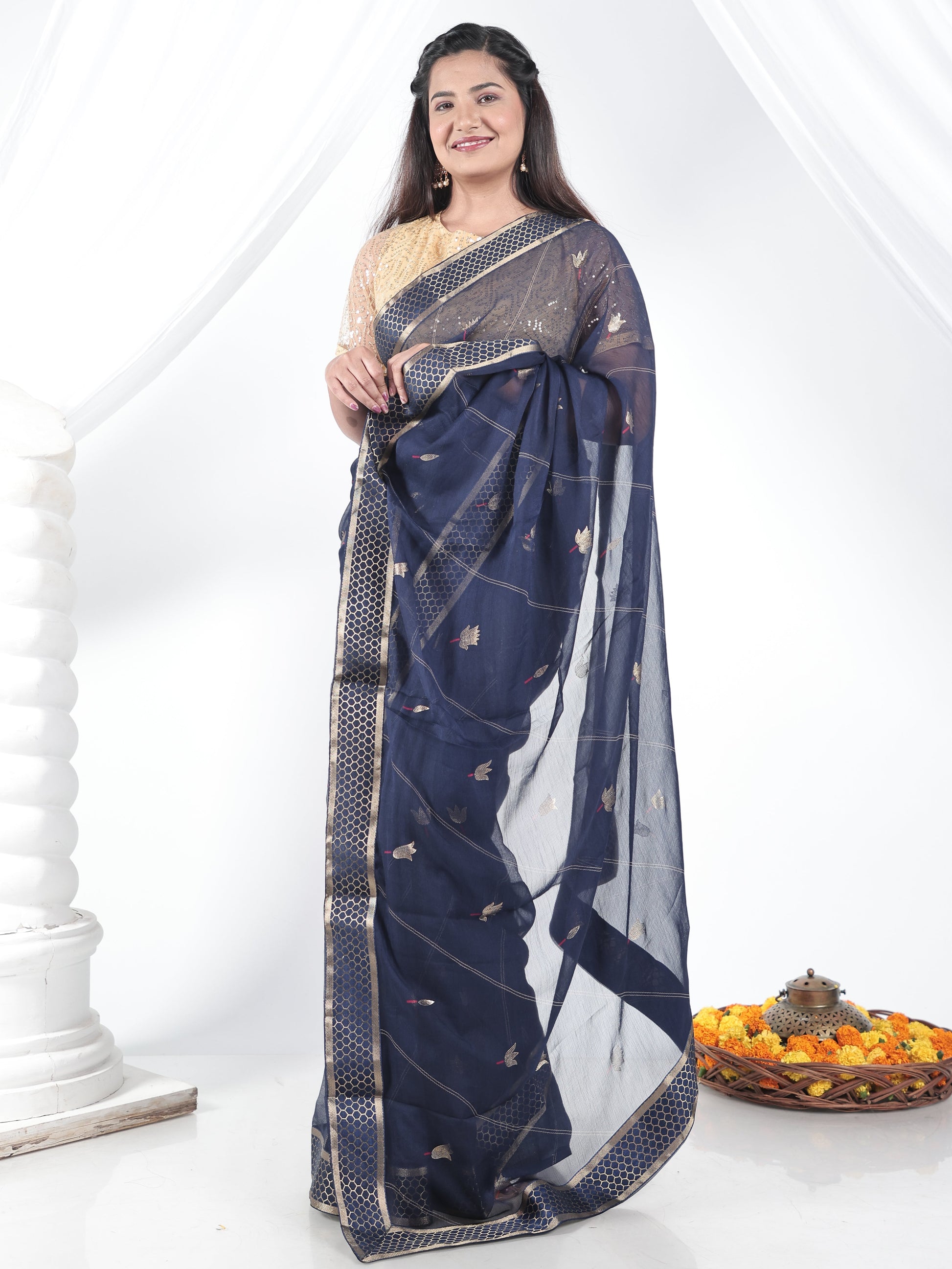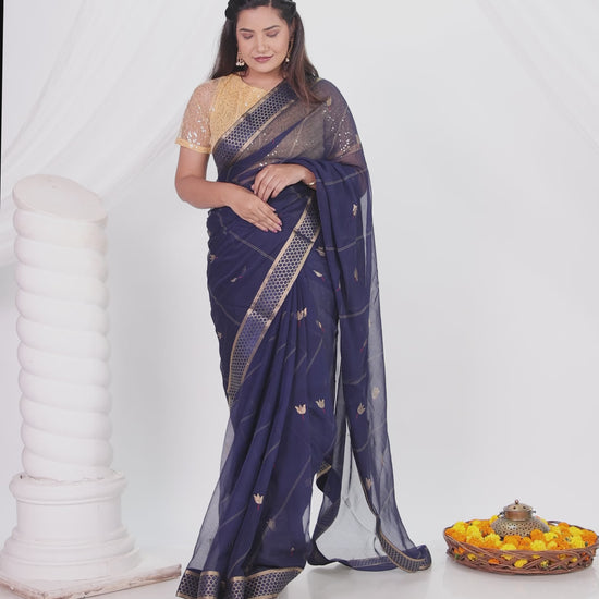 Chiffon Gold foil Navy Blue Saree