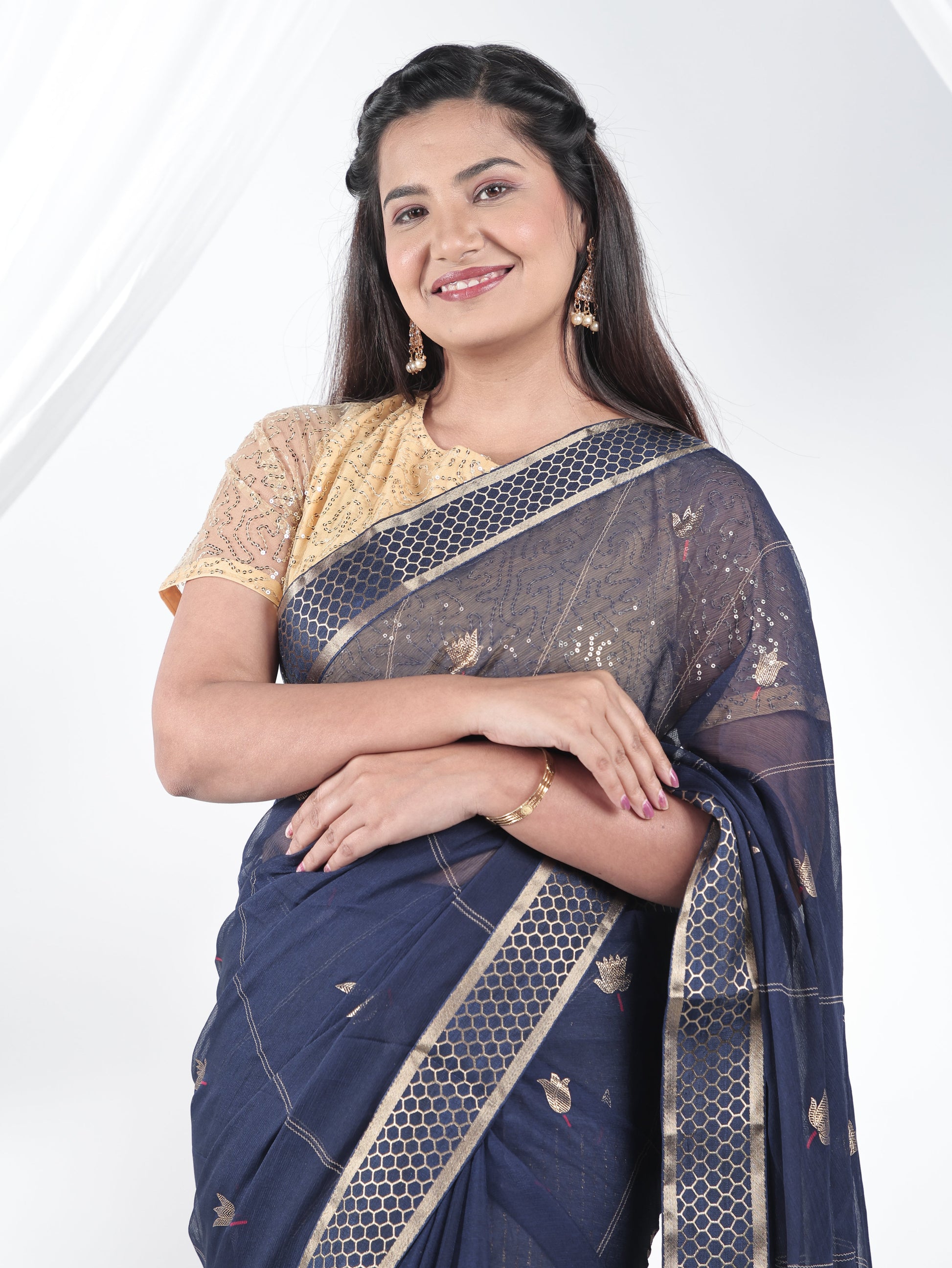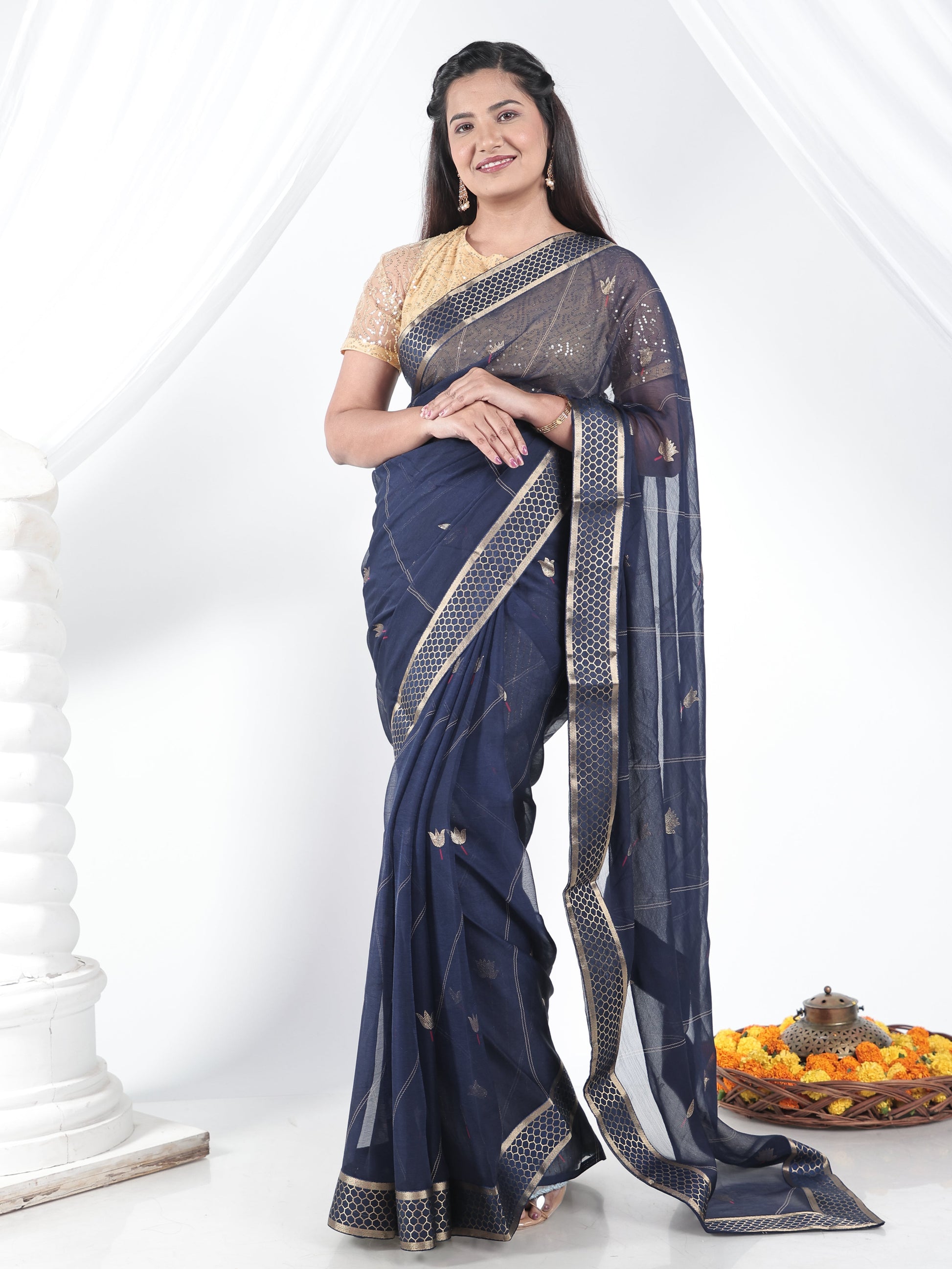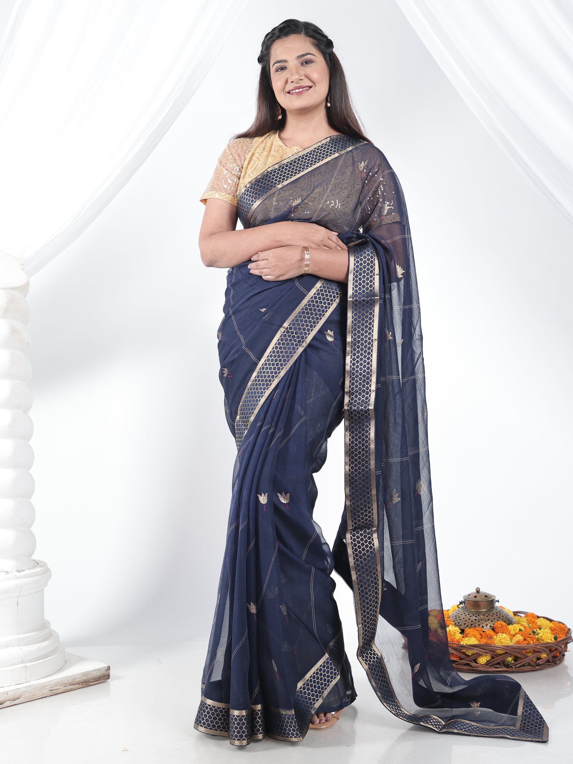 Chiffon Gold foil Navy Blue Saree