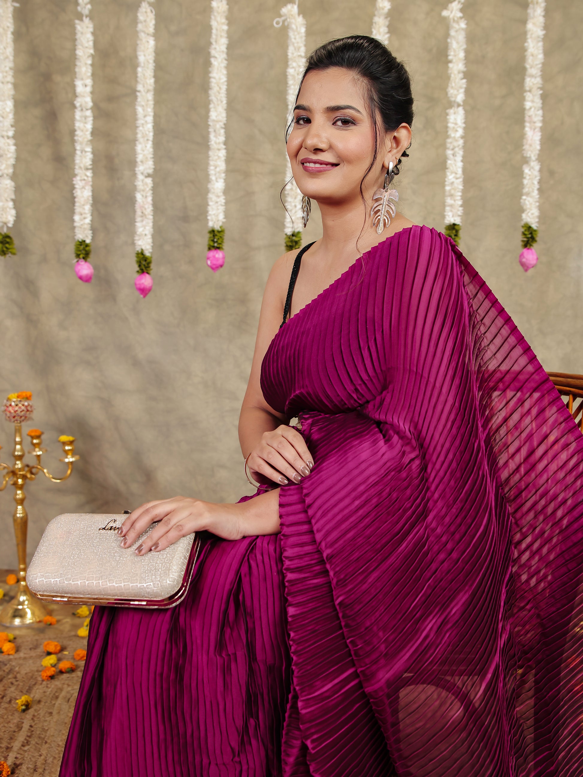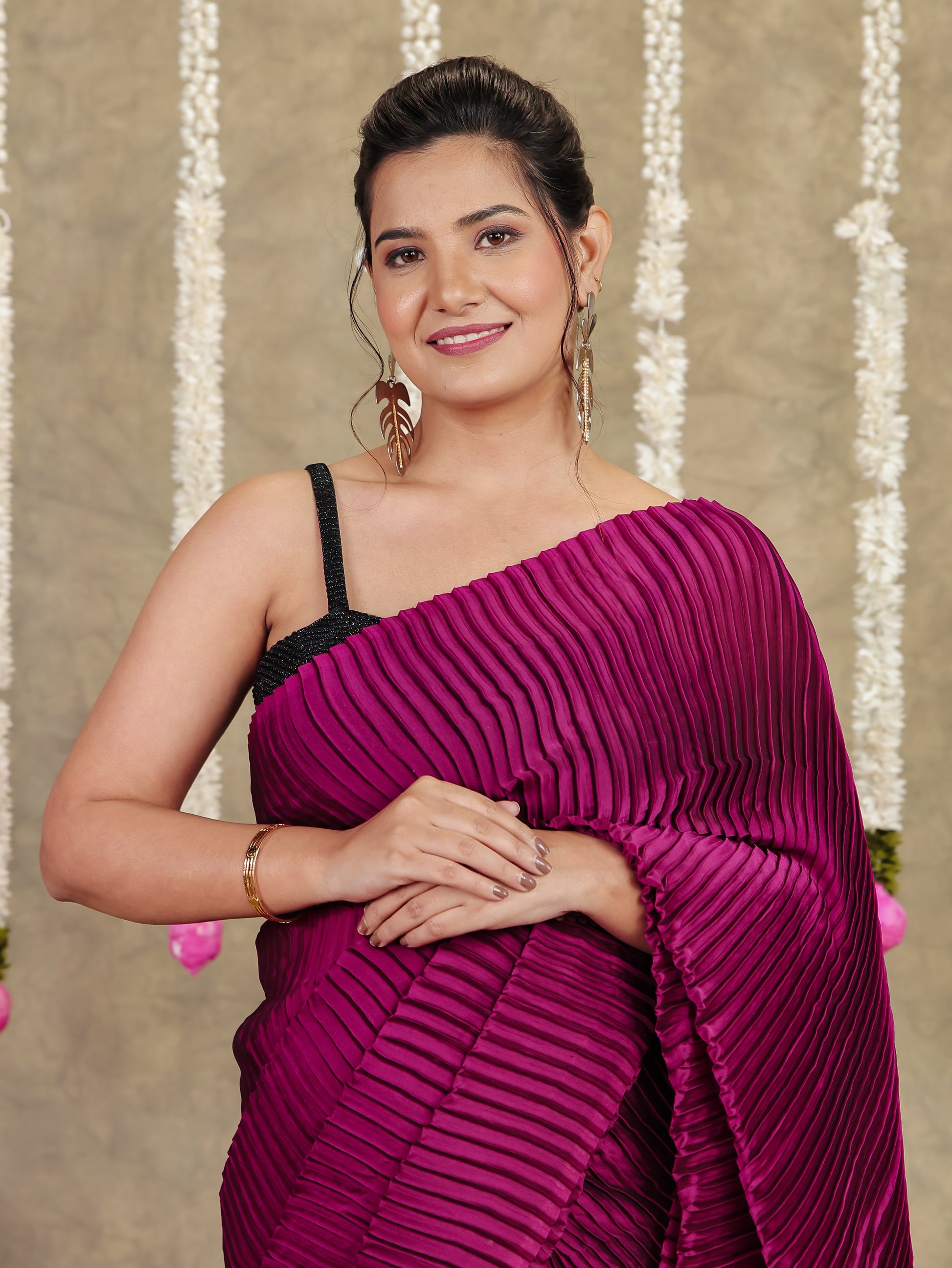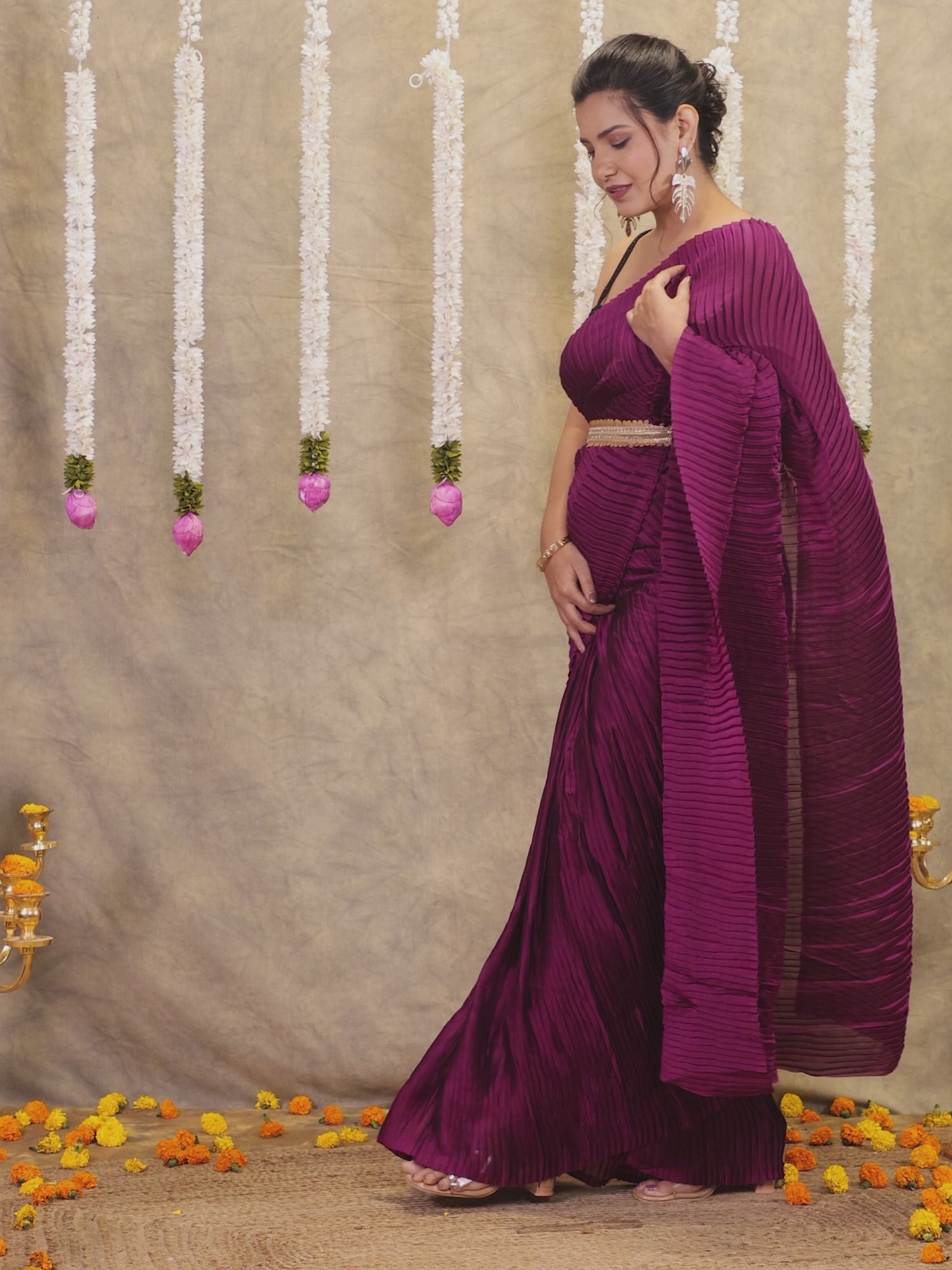 Pleated Chiffon Solid Burgundy Saree