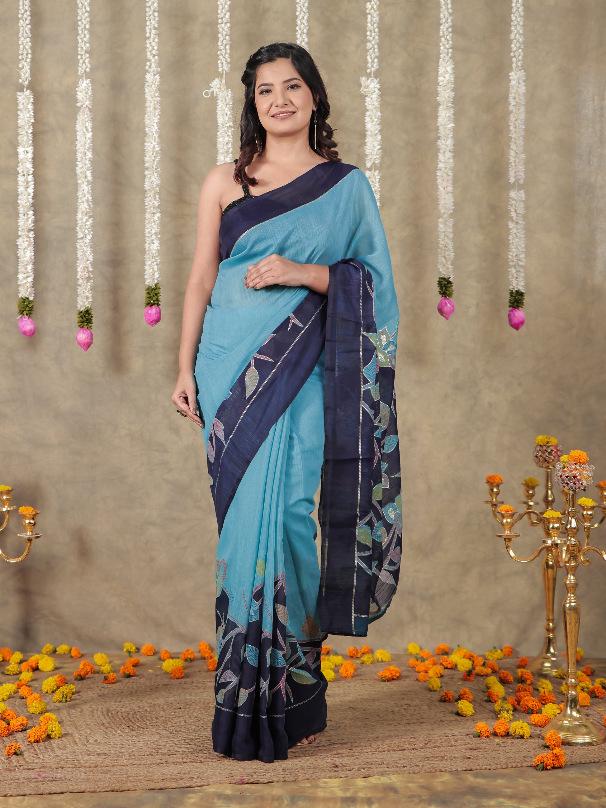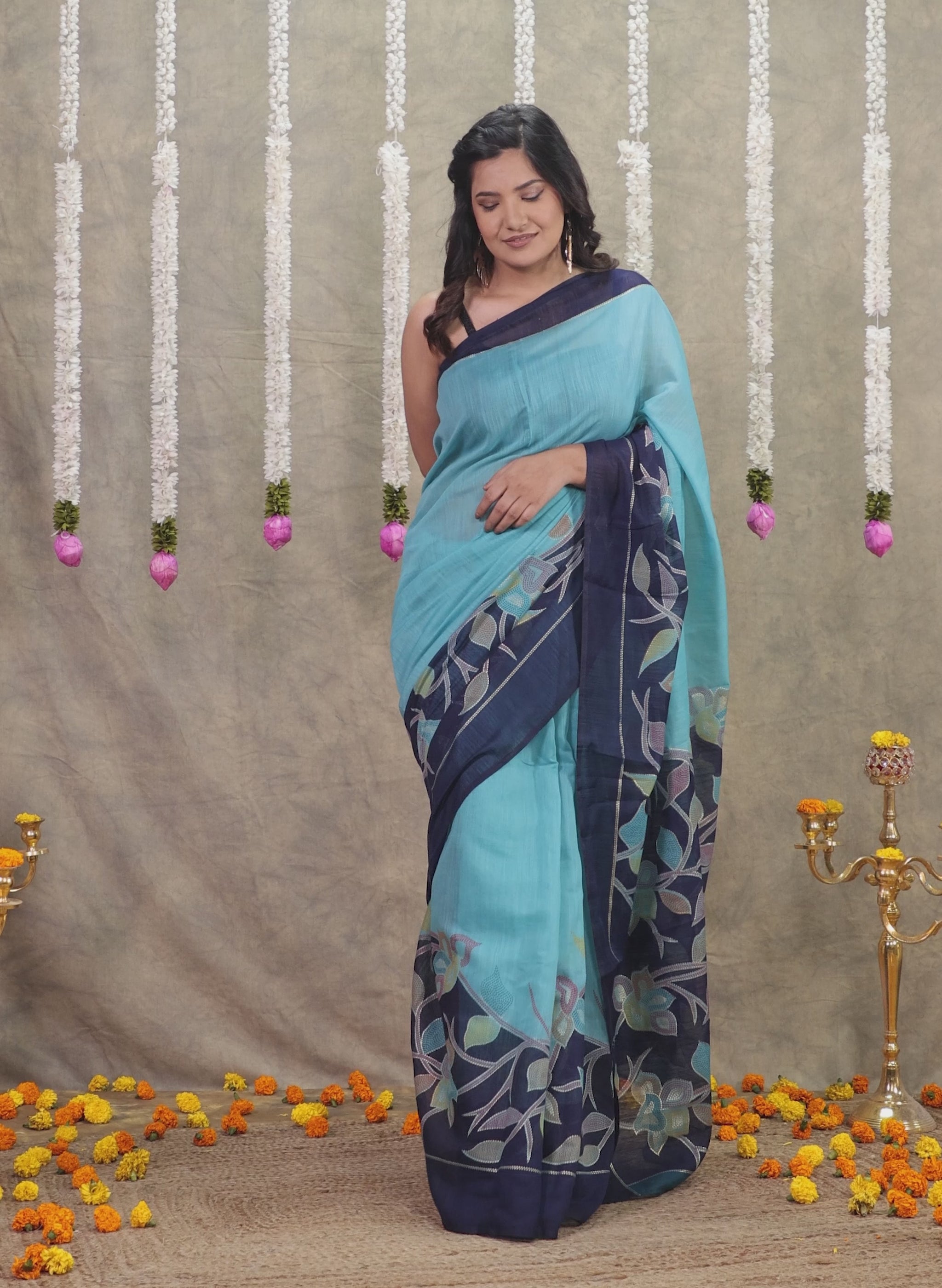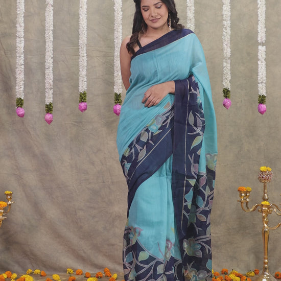 Cotton Silk Gold foil Turquoise Saree
