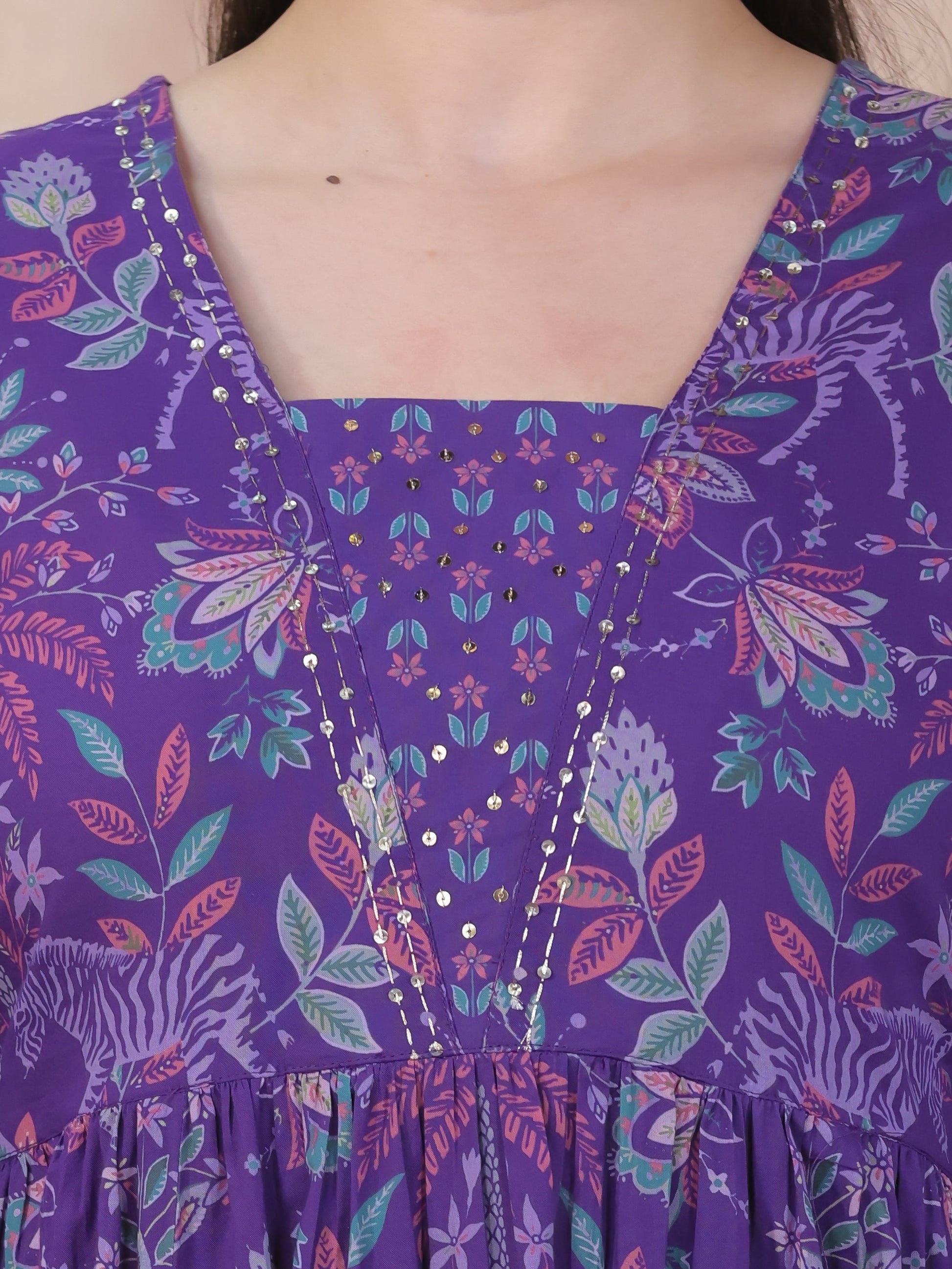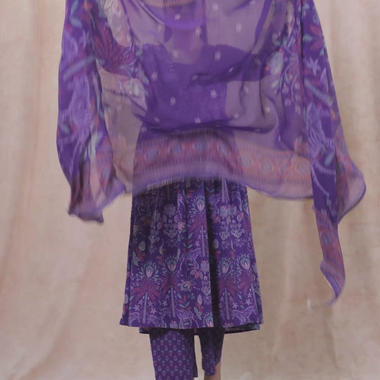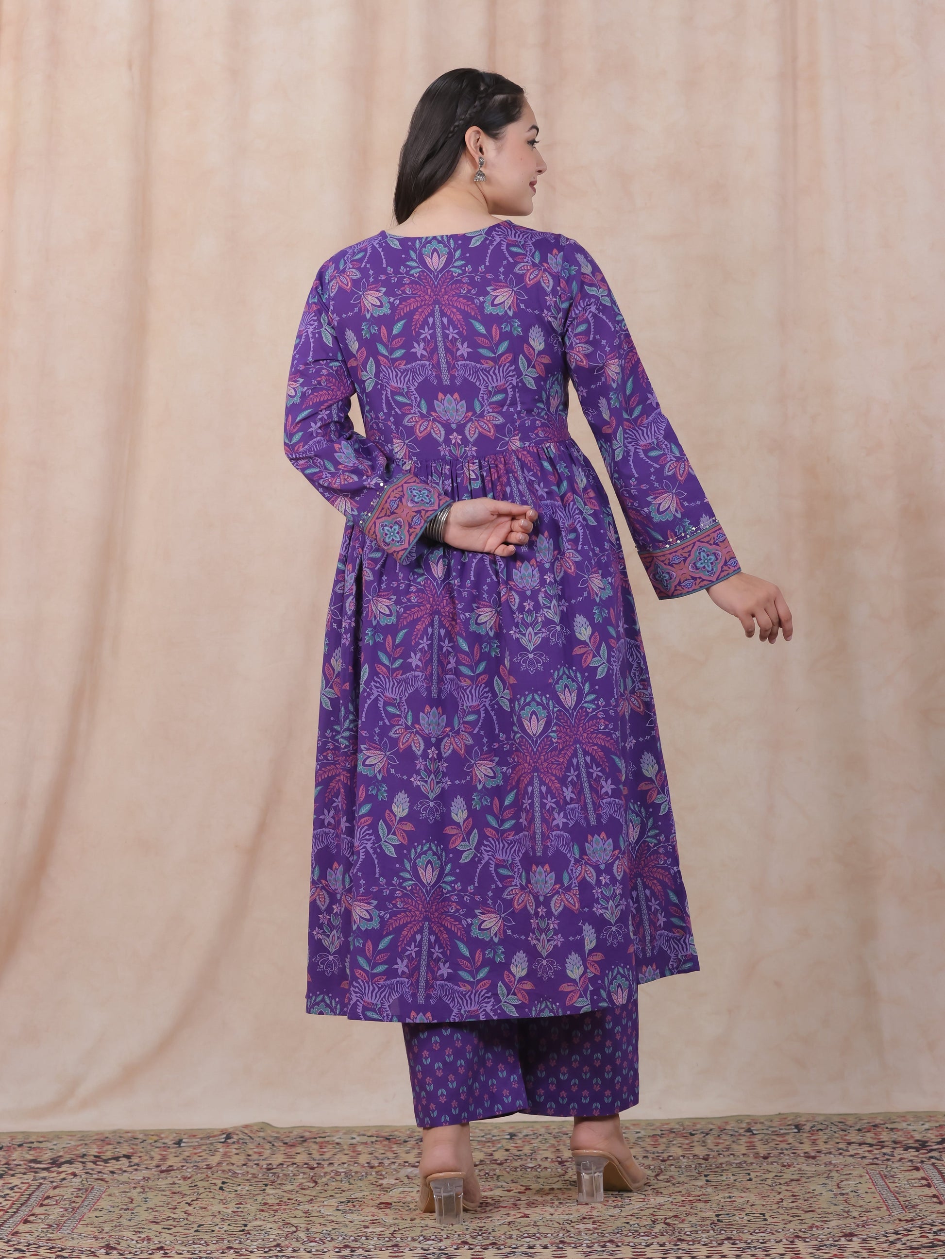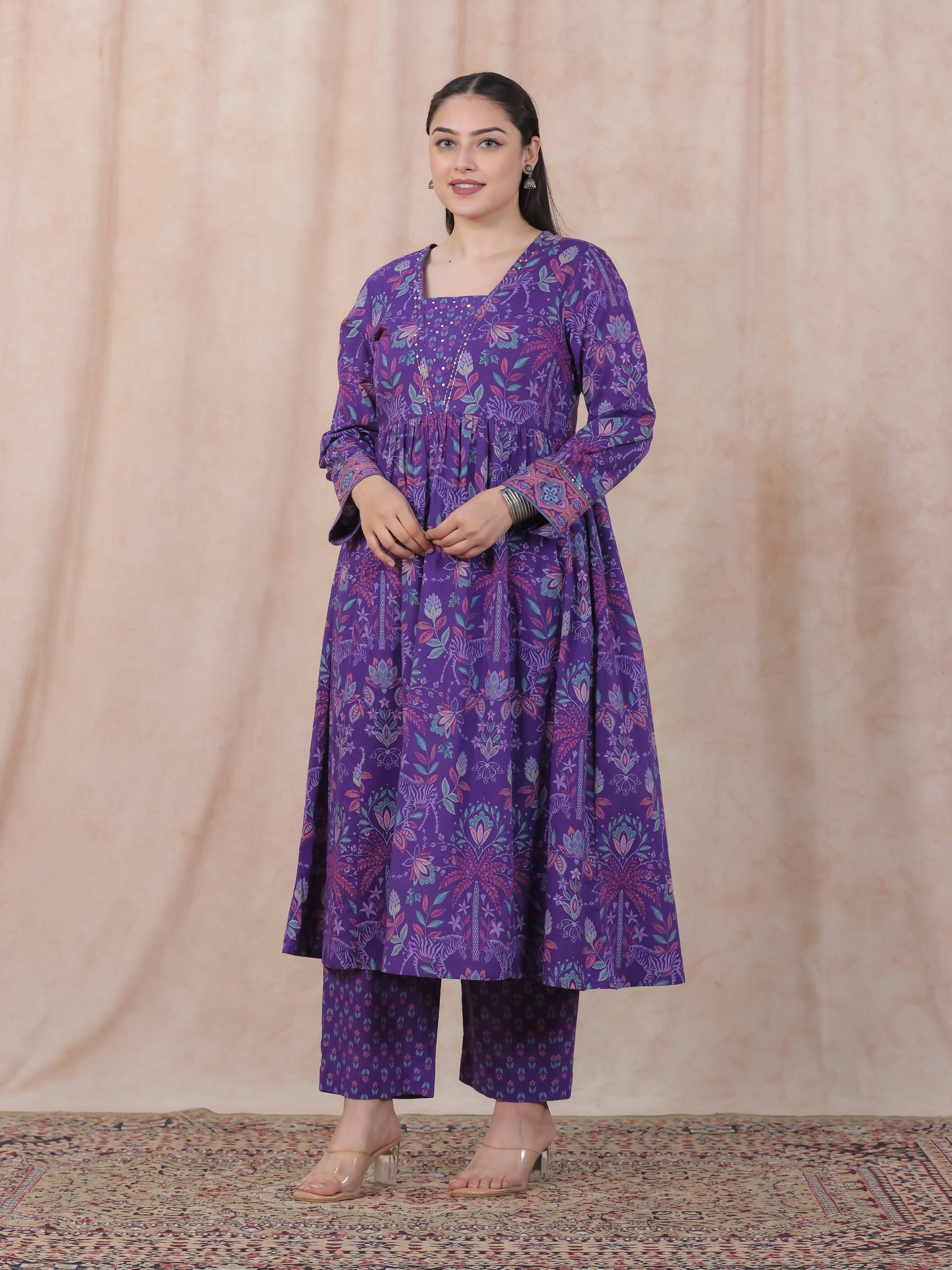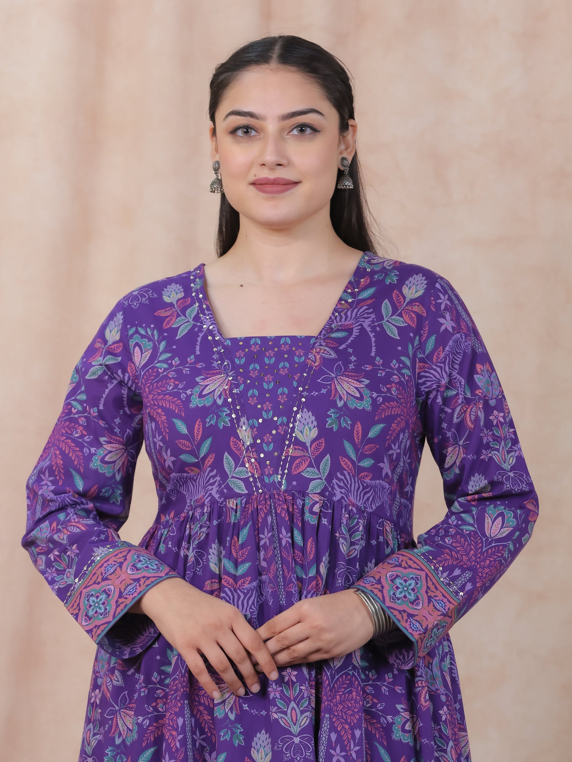 Embroidered Soft Cotton Floral Anarkali Purple Kurta
