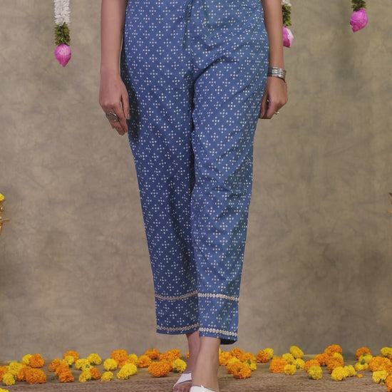These Blue trouser crafted from breathable Soft Cotton combine comfort and style. The Bandhani pattern adds a modern twist, while pockets make them practical for daily wear. Ideal for casual outings or workdays, they pair effortlessly with kurtas, tops, or tunics. Keep them looking fresh with minimal care and enjoy their all-day ease.
