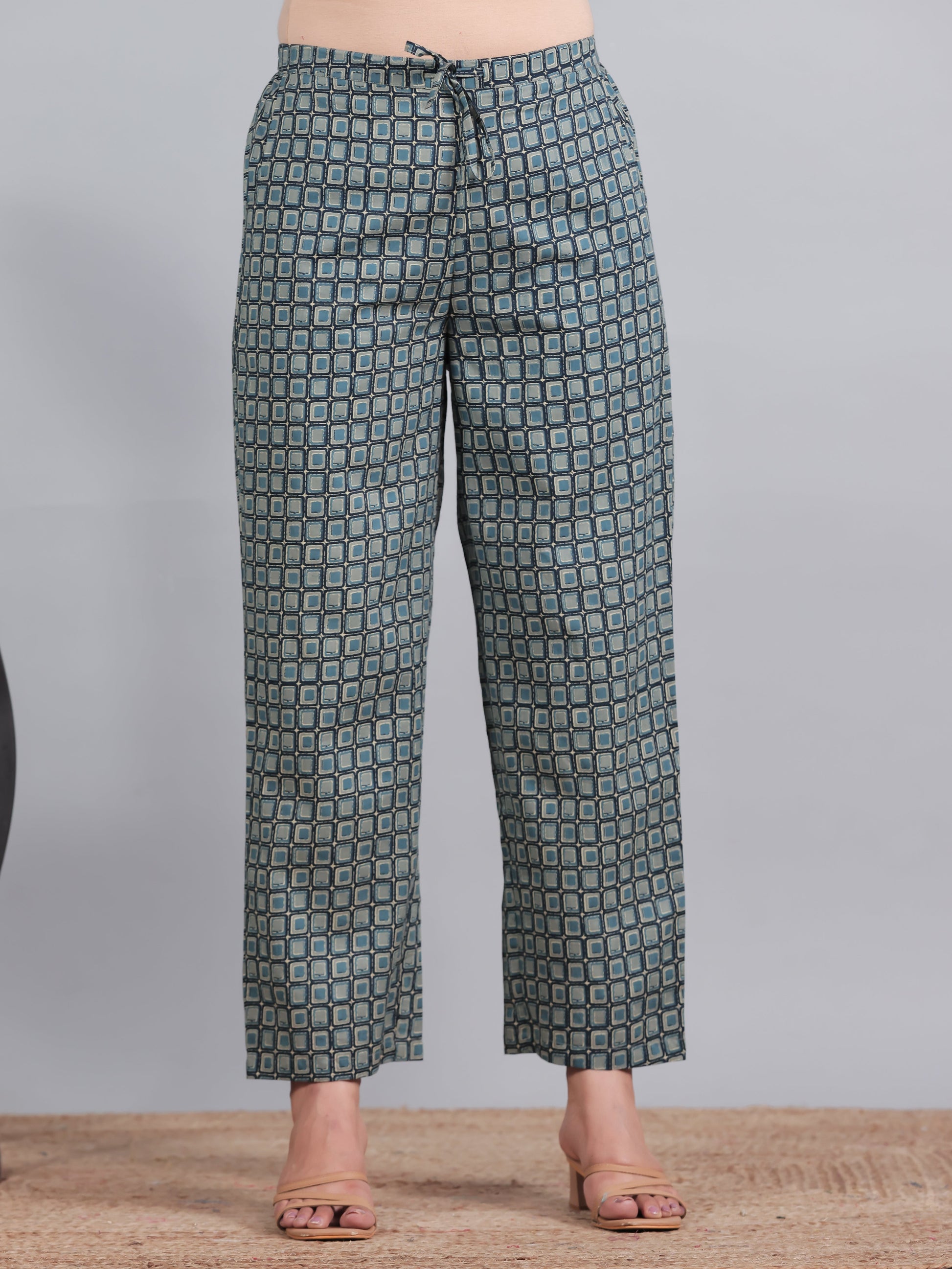 Soft Cotton Geometric Blue Straight Trousers