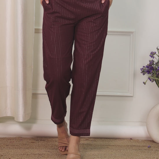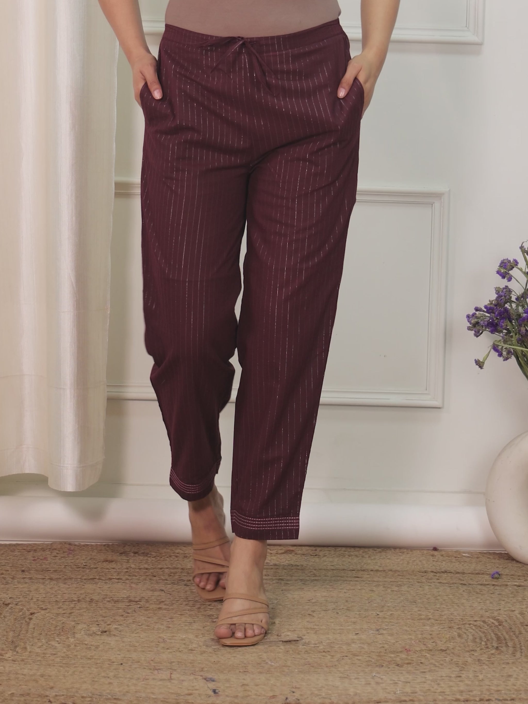 Embroidered Lurex Cotton Solid Brown Tapered Trousers