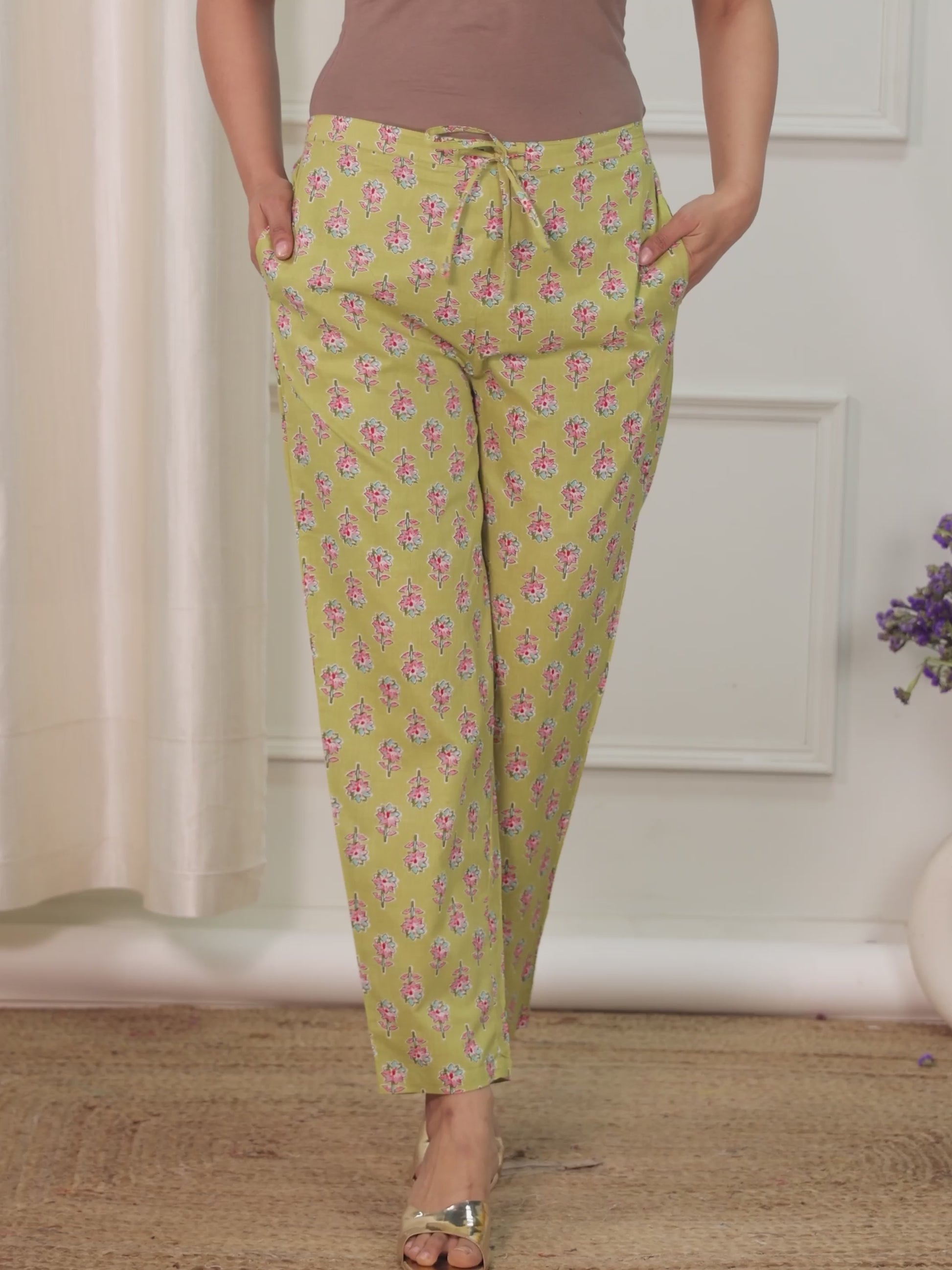 Upgrade your wardrobe with these Green bottoms made from lightweight Soft Cotton. The Floral accents bring subtle charm, while pockets make them practical for all-day wear. Perfect for pairing with ethnic kurtas or western blouses, these bottoms are a go-to choice for comfort and style. Easy care ensures they stay fresh season after season.
