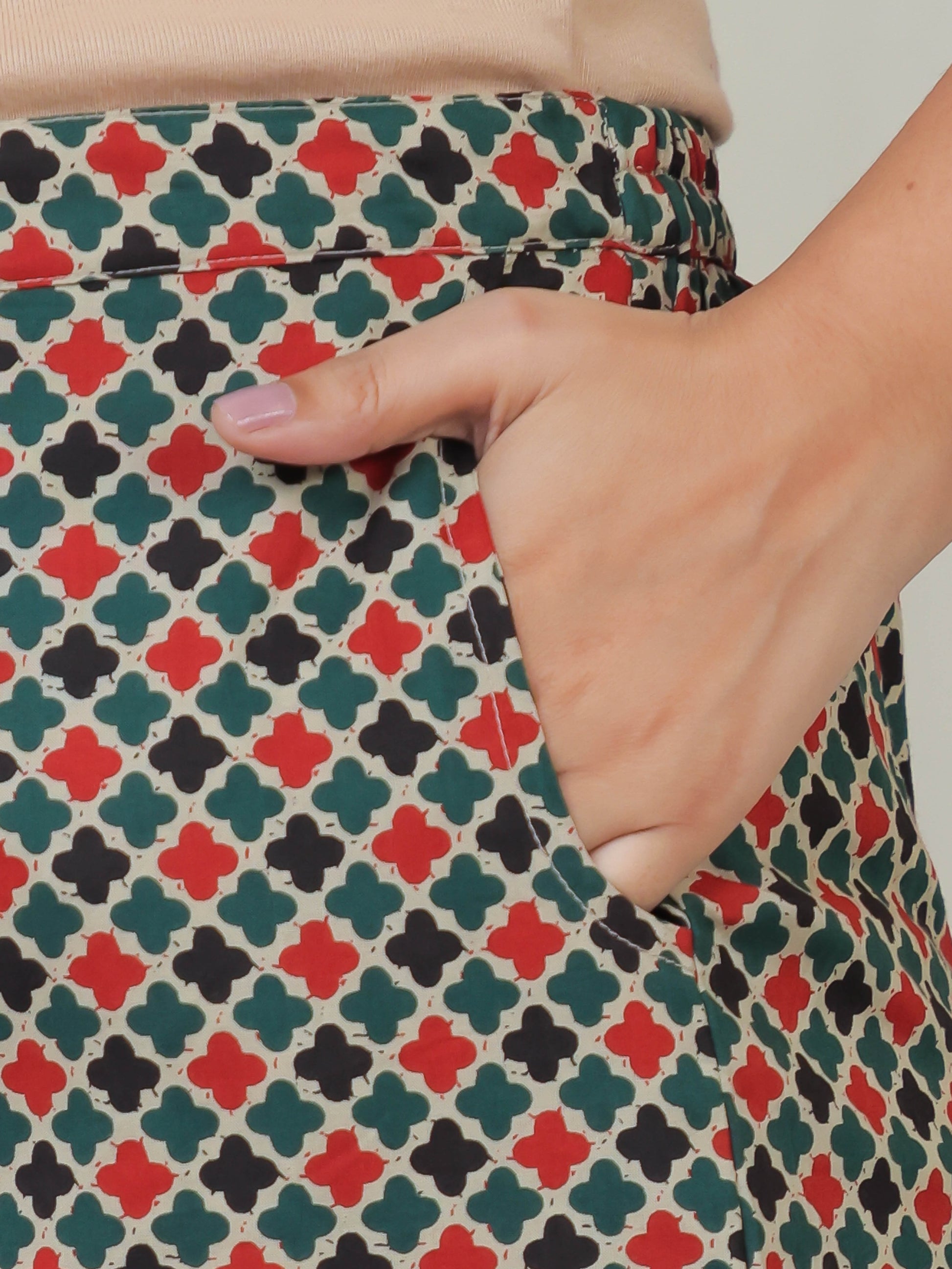 These Green trouser crafted from breathable Soft Cotton combine comfort and style. The Geometric pattern adds a modern twist, while pockets make them practical for daily wear. Ideal for casual outings or workdays, they pair effortlessly with kurtas, tops, or tunics. Keep them looking fresh with minimal care and enjoy their all-day ease.