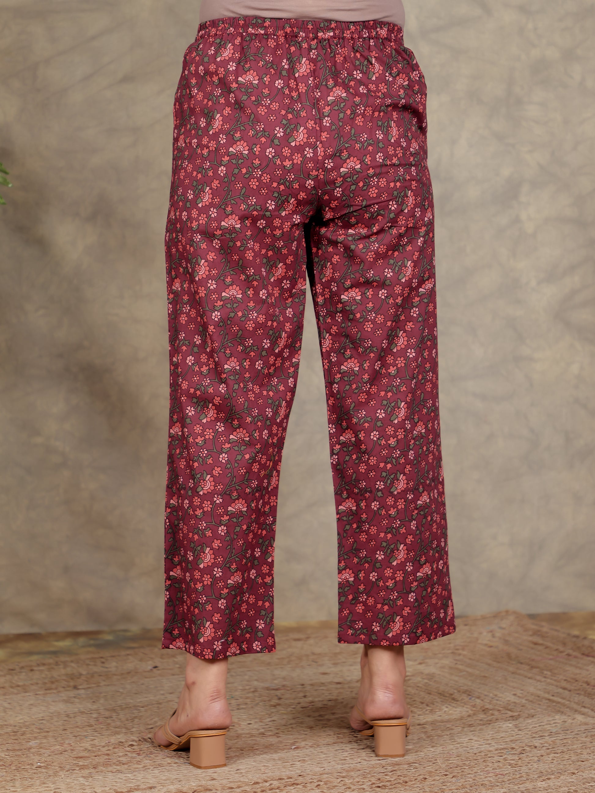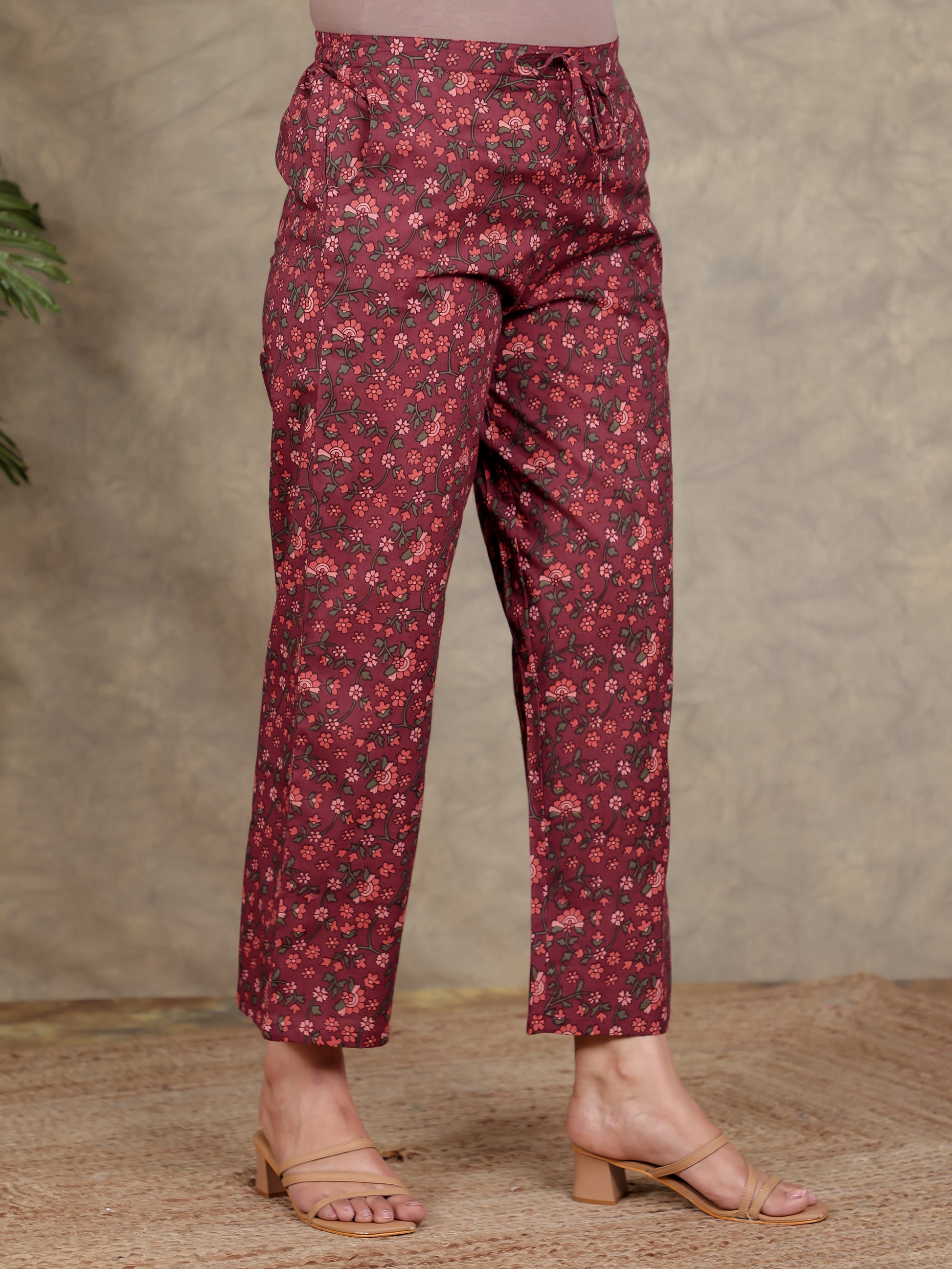 These Maroon trouser crafted from breathable Soft Cotton combine comfort and style. The Floral pattern adds a modern twist, while pockets make them practical for daily wear. Ideal for casual outings or workdays, they pair effortlessly with kurtas, tops, or tunics. Keep them looking fresh with minimal care and enjoy their all-day ease.