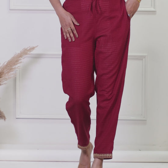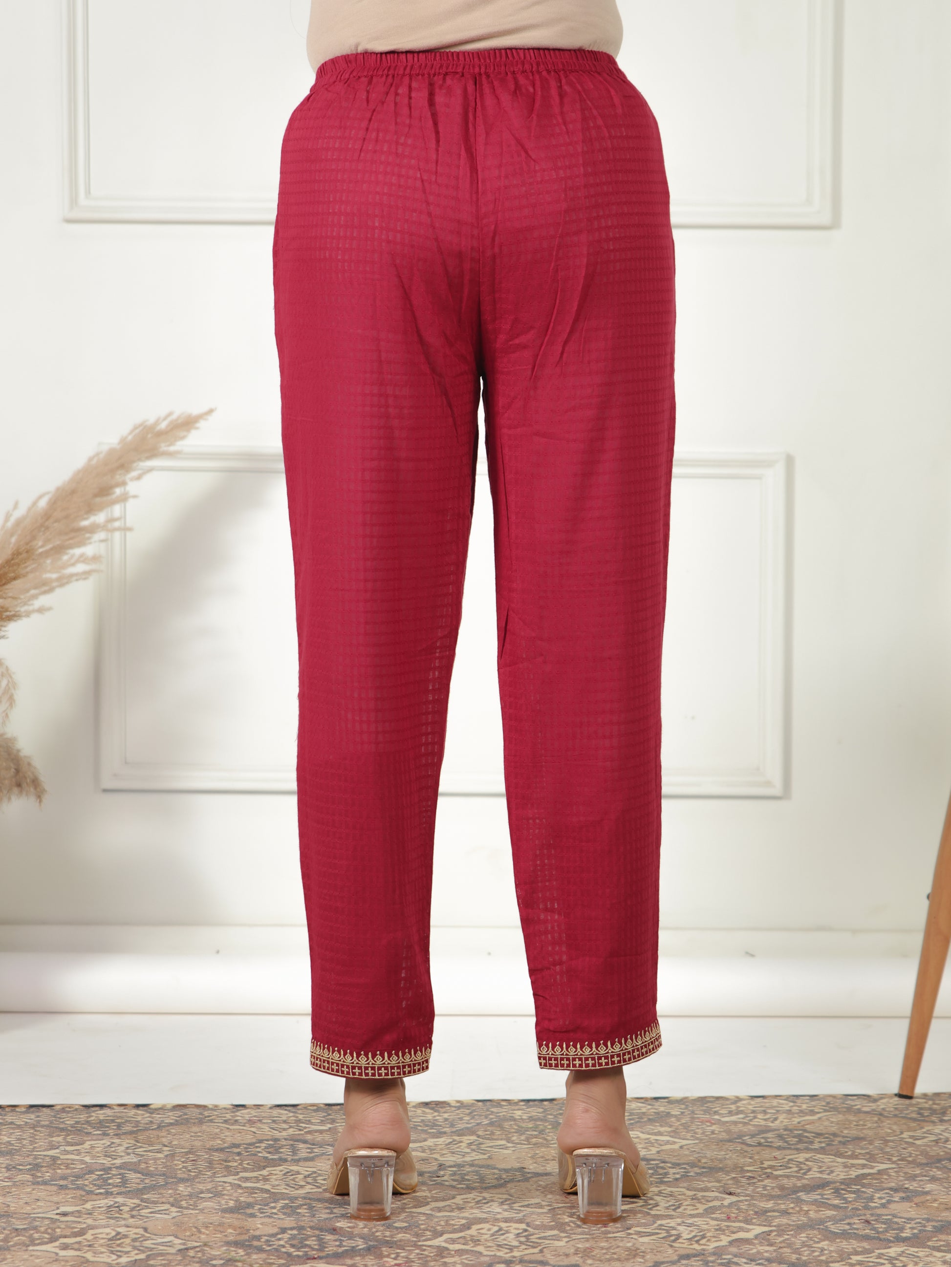 Embroidered Cotton Dobby Solid Maroon Tapered Trousers