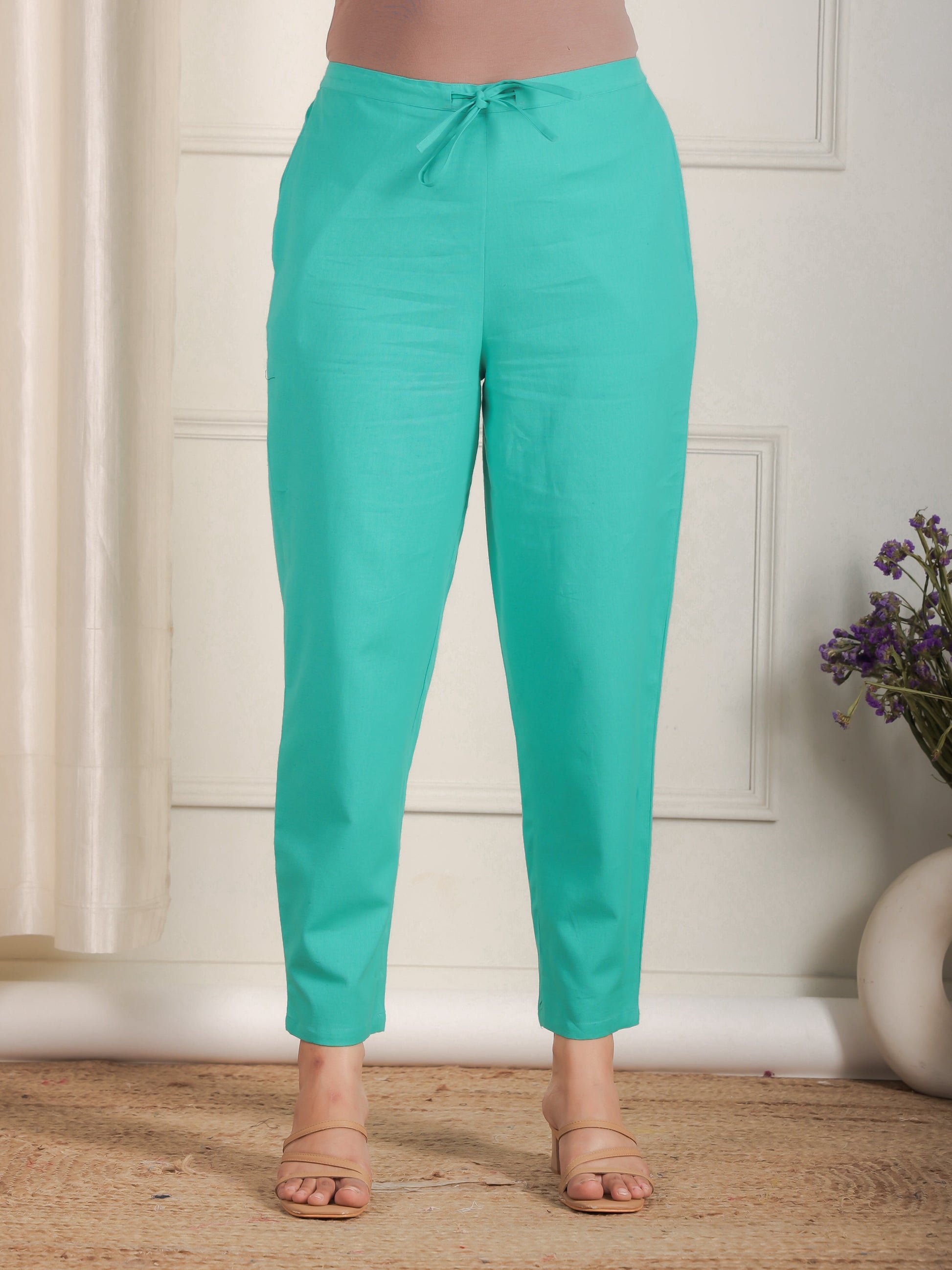These Mint Green trouser crafted from breathable Linen Cotton combine comfort and style. The Solid pattern adds a modern twist, while pockets make them practical for daily wear. Ideal for casual outings or workdays, they pair effortlessly with kurtas, tops, or tunics. Keep them looking fresh with minimal care and enjoy their all-day ease.