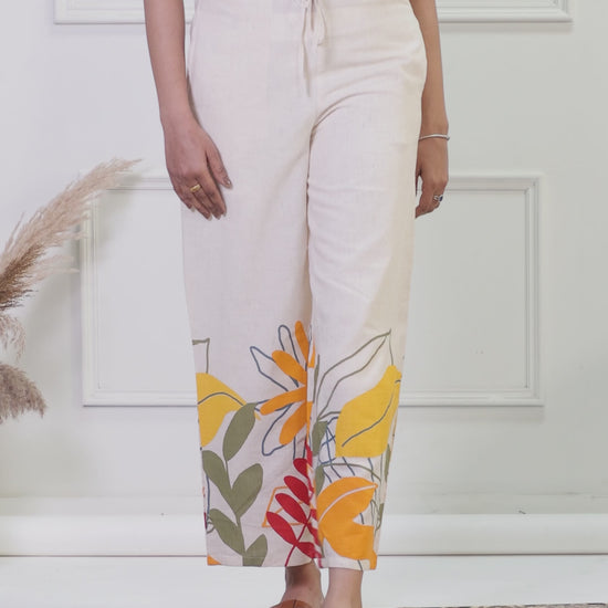These Off White palazzos crafted from soft Linen Cotton bring effortless elegance to your wardrobe. The Foliage design adds a playful touch, while pockets offer convenience for daily wear. Perfect for summer outings or relaxed evenings, they pair beautifully with kurtas, tunics, or crop tops. Easy care keeps them looking fresh season after season.