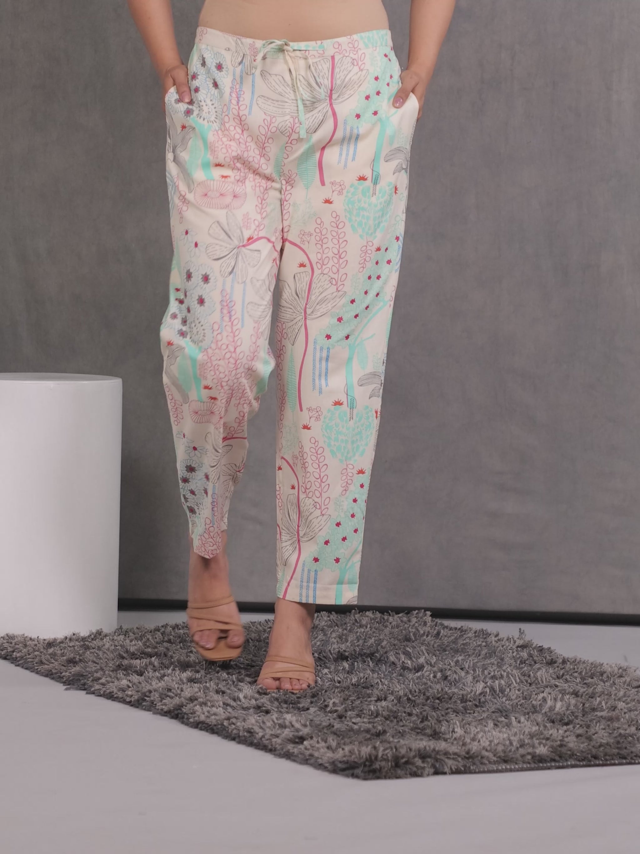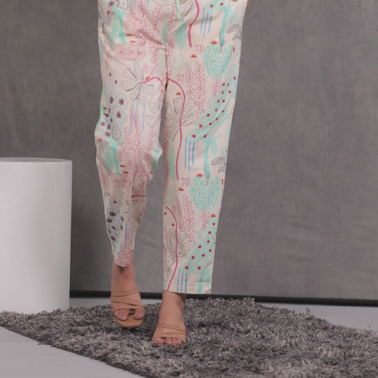 Linen Cotton Foliage Off White Tapered Trousers