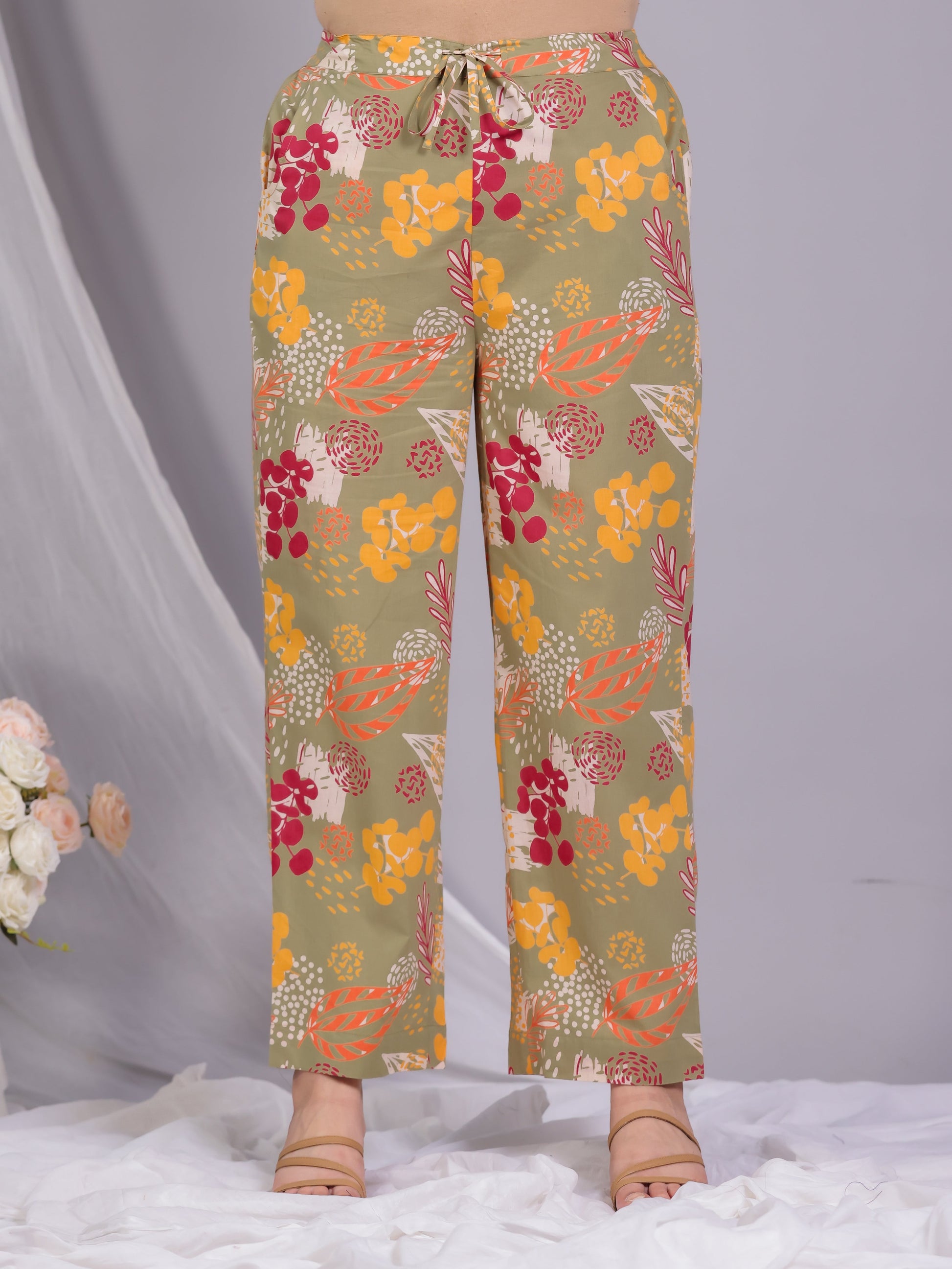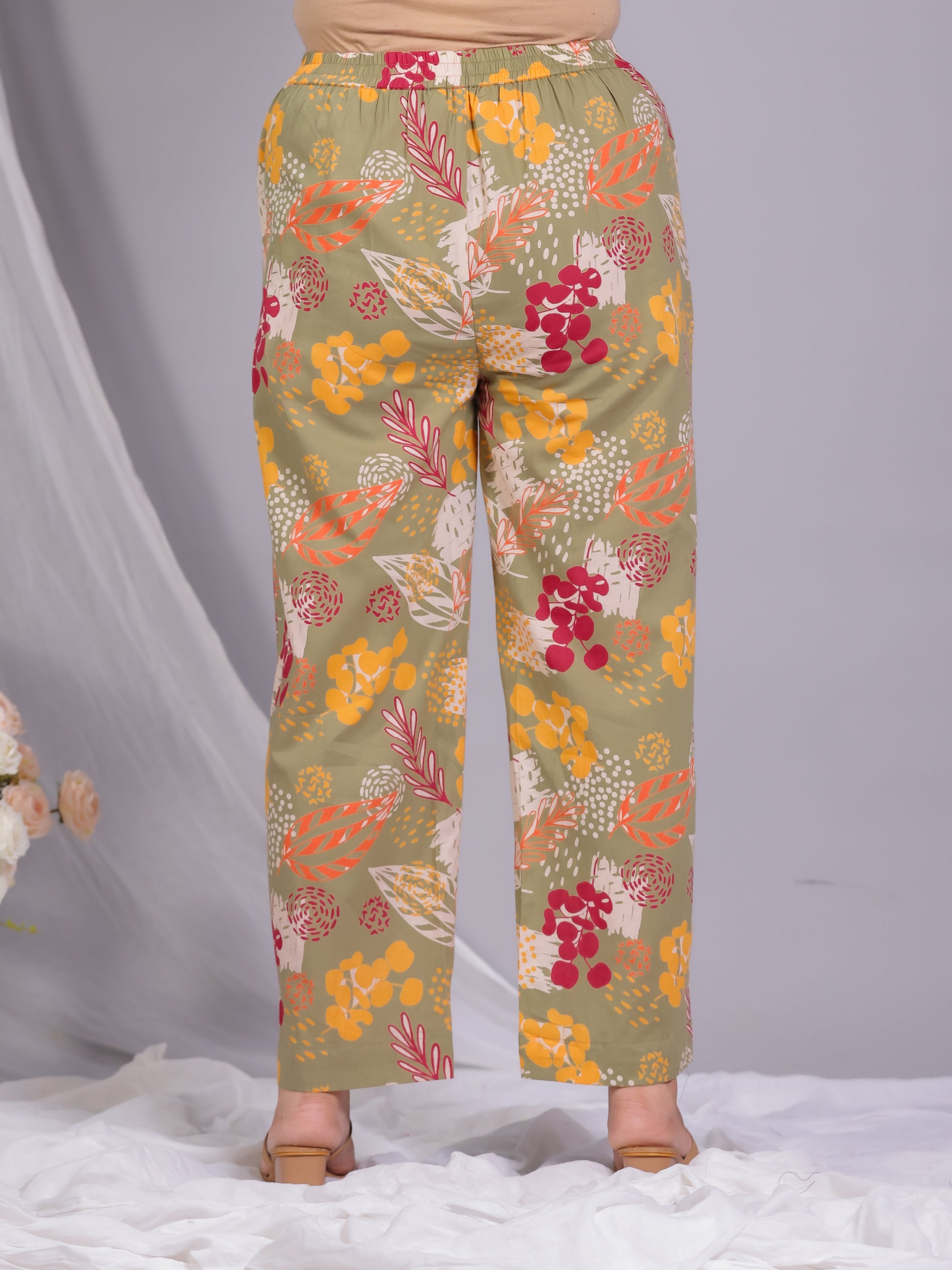 Soft Cotton Floral Olive Straight Trousers