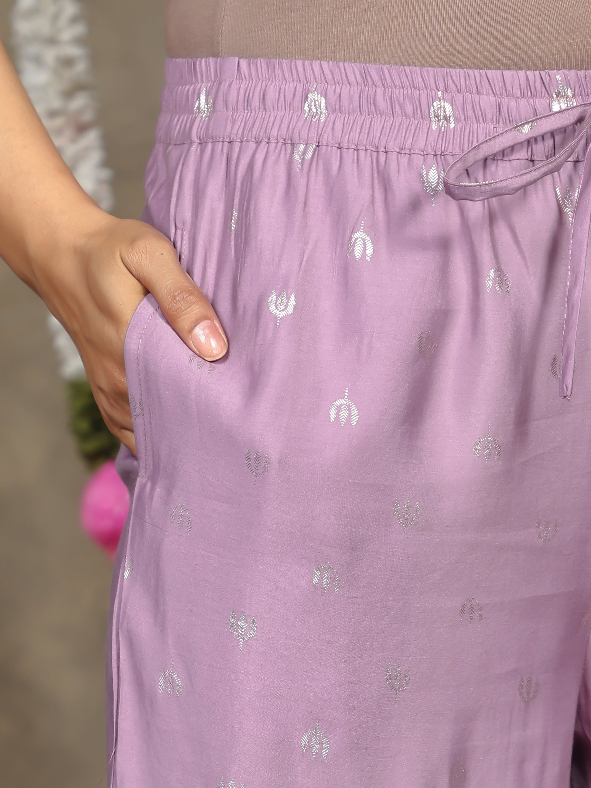 Upgrade your wardrobe with these Purple bottoms made from lightweight Chanderi. The Gold foil accents bring subtle charm, while pockets make them practical for all-day wear. Perfect for pairing with ethnic kurtas or western blouses, these bottoms are a go-to choice for comfort and style. Easy care ensures they stay fresh season after season.