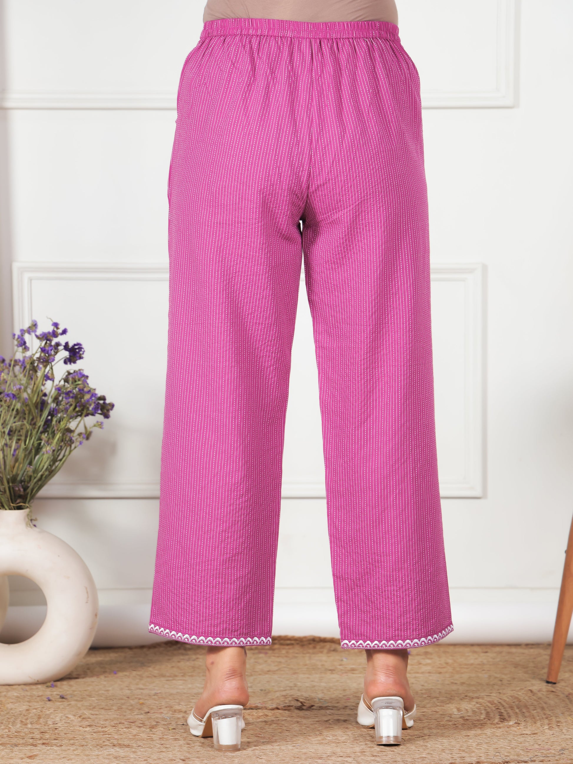 Crafted from Kantha Cotton, these Purple bottoms are designed for all-day comfort. The chic Solid work adds flair, and pockets provide convenience for carrying essentials. Great for casual days, shopping trips, or work, these bottoms pair effortlessly with your favourite tops. Their durable design and easy maintenance make them a practical staple.