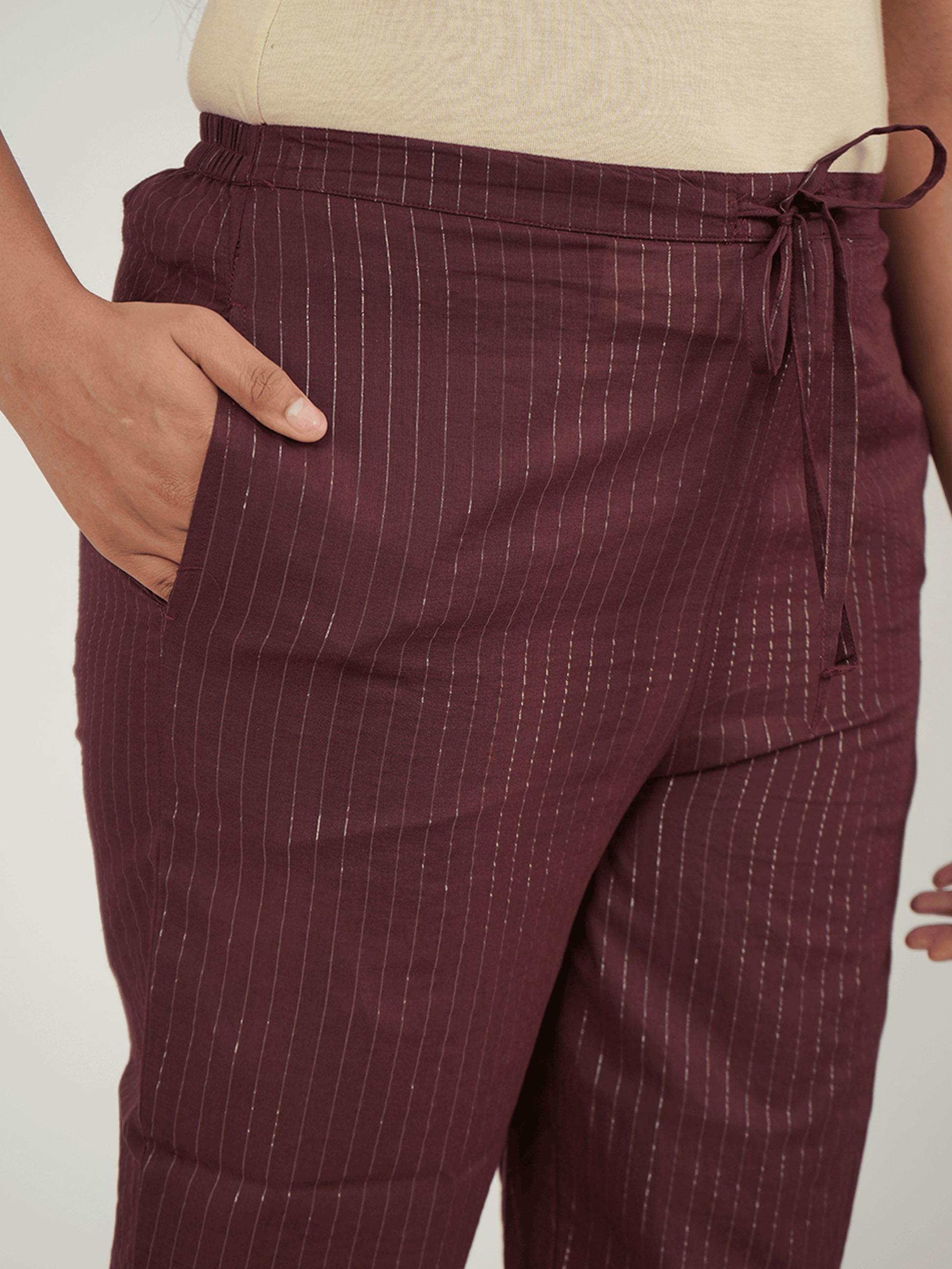 Crafted from Lurex Cotton, these Purple bottoms are designed for all-day comfort. The chic Solid work adds flair, and pockets provide convenience for carrying essentials. Great for casual days, shopping trips, or work, these bottoms pair effortlessly with your favourite tops. Their durable design and easy maintenance make them a practical staple.