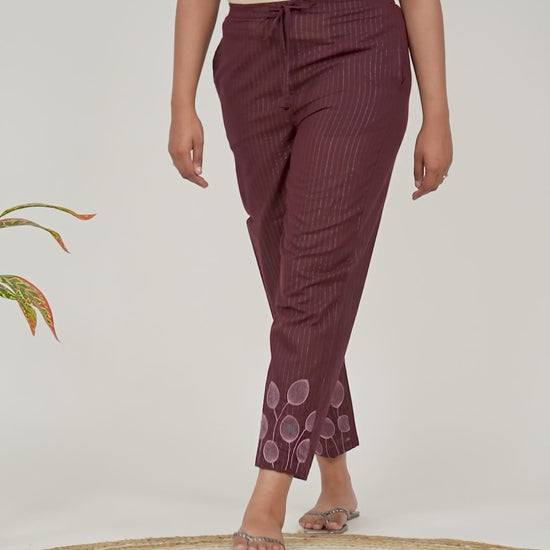 Embroidered Lurex Cotton Solid Purple Tapered Trousers