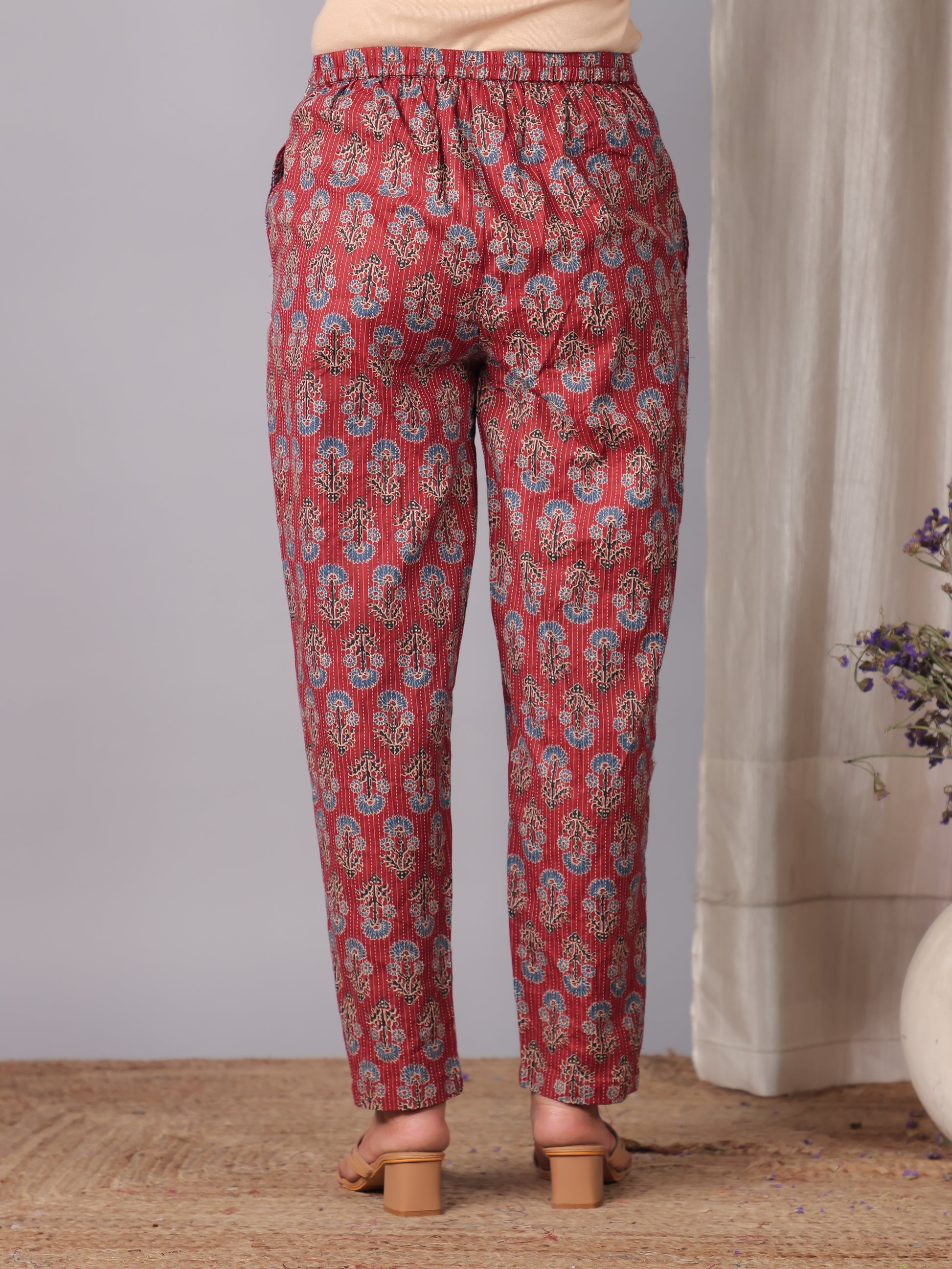 These Red trouser crafted from breathable Kantha Cotton combine comfort and style. The Geometric pattern adds a modern twist, while pockets make them practical for daily wear. Ideal for casual outings or workdays, they pair effortlessly with kurtas, tops, or tunics. Keep them looking fresh with minimal care and enjoy their all-day ease.