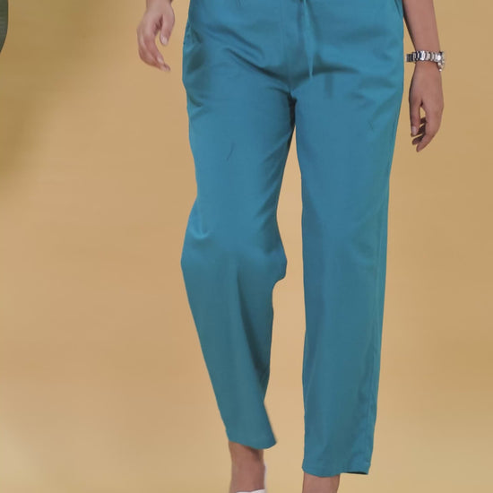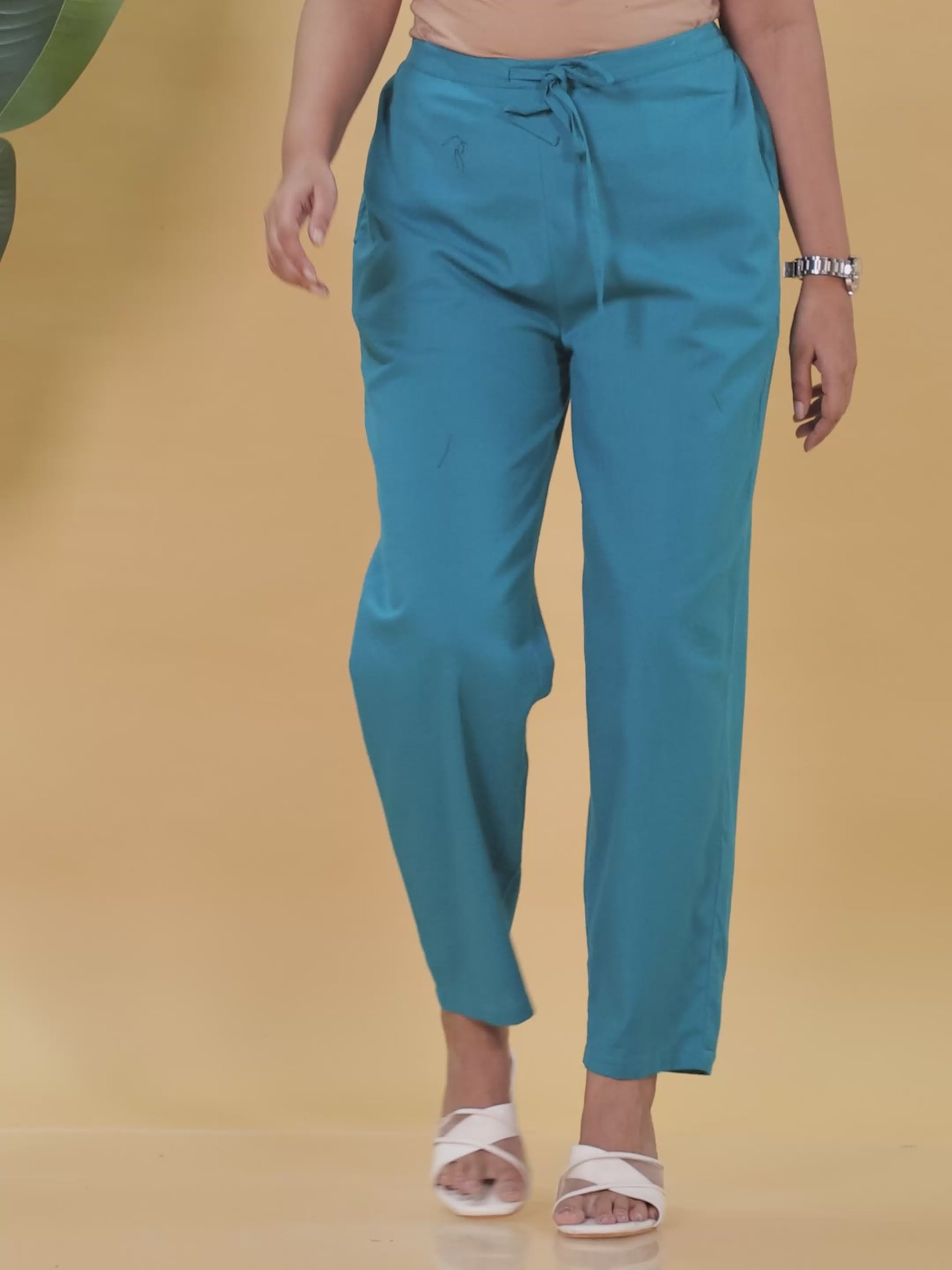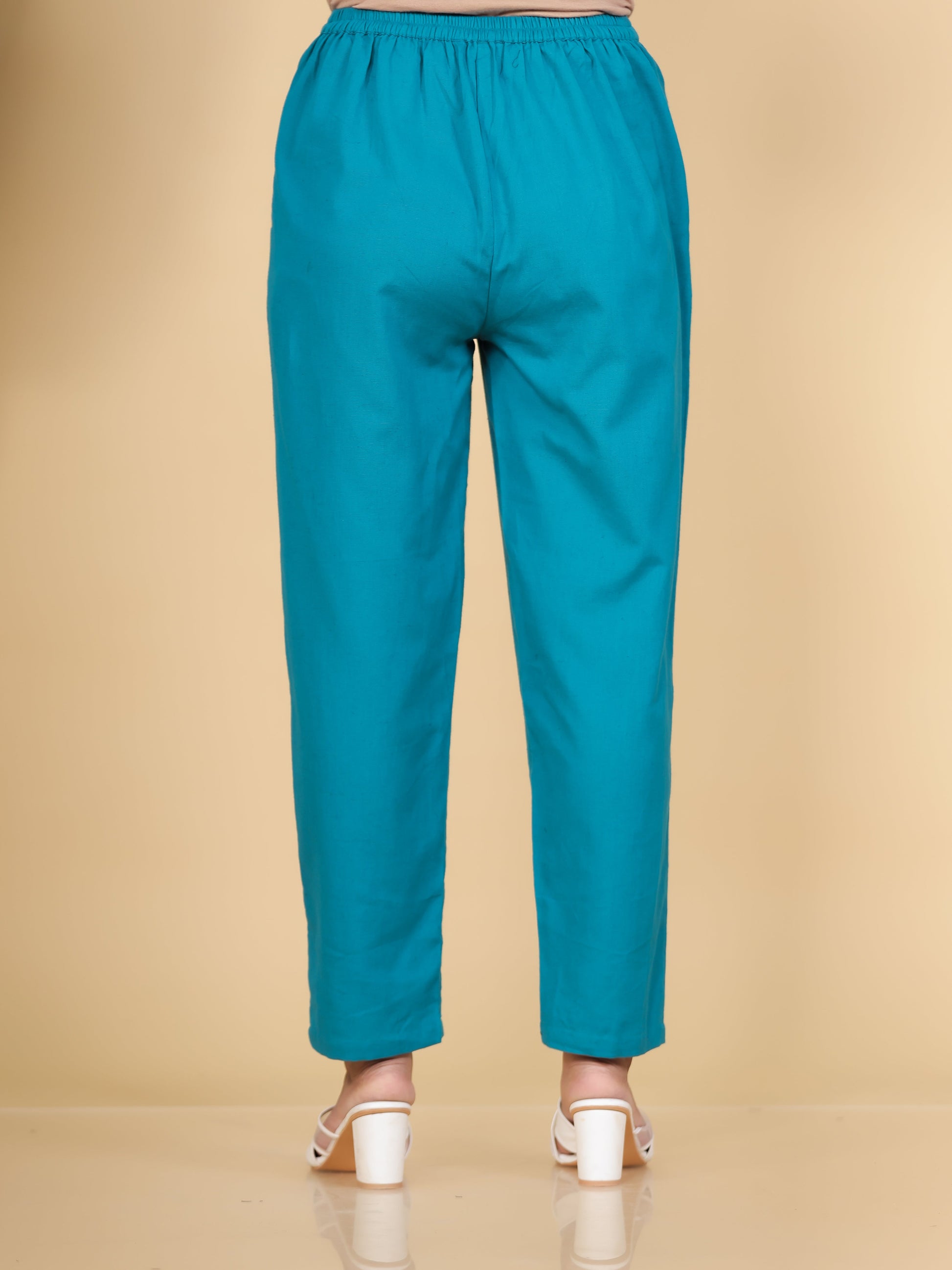 Linen Cotton Solid Teal Trousers Tapered Trousers