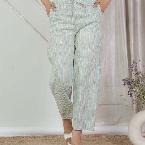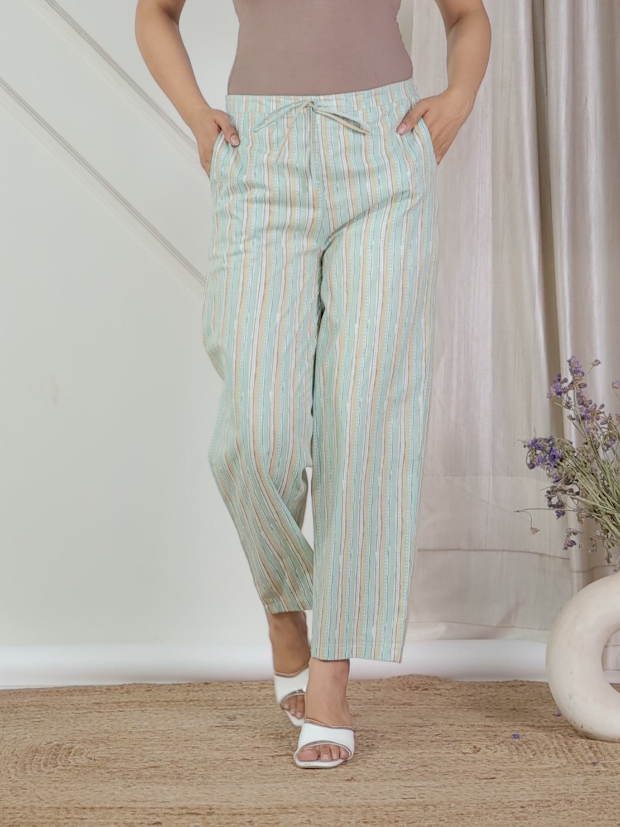 These Teal trouser crafted from breathable Soft Cotton combine comfort and style. The Striped pattern adds a modern twist, while pockets make them practical for daily wear. Ideal for casual outings or workdays, they pair effortlessly with kurtas, tops, or tunics. Keep them looking fresh with minimal care and enjoy their all-day ease.