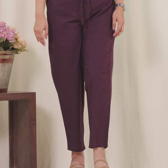 Soft Cotton Solid Wine Tapered Tapered Trousers