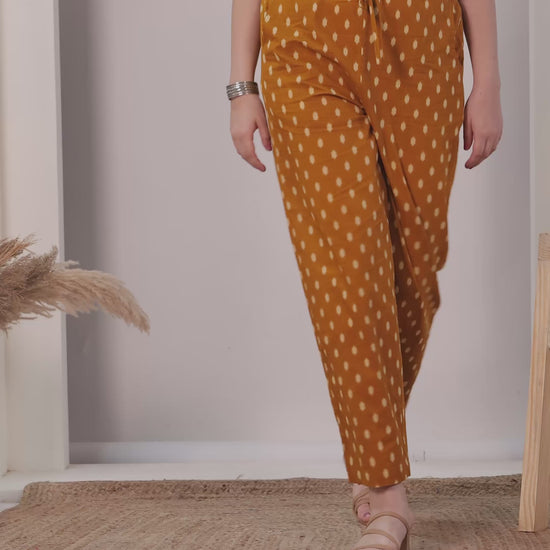 These Yellow trouser crafted from breathable Soft Cotton combine comfort and style. The Ikat pattern adds a modern twist, while pockets make them practical for daily wear. Ideal for casual outings or workdays, they pair effortlessly with kurtas, tops, or tunics. Keep them looking fresh with minimal care and enjoy their all-day ease.