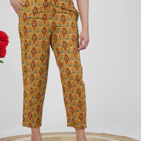 Upgrade your wardrobe with these Yellow bottoms made from lightweight Soft Cotton. The Ikat accents bring subtle charm, while pockets make them practical for all-day wear. Perfect for pairing with ethnic kurtas or western blouses, these bottoms are a go-to choice for comfort and style. Easy care ensures they stay fresh season after season.