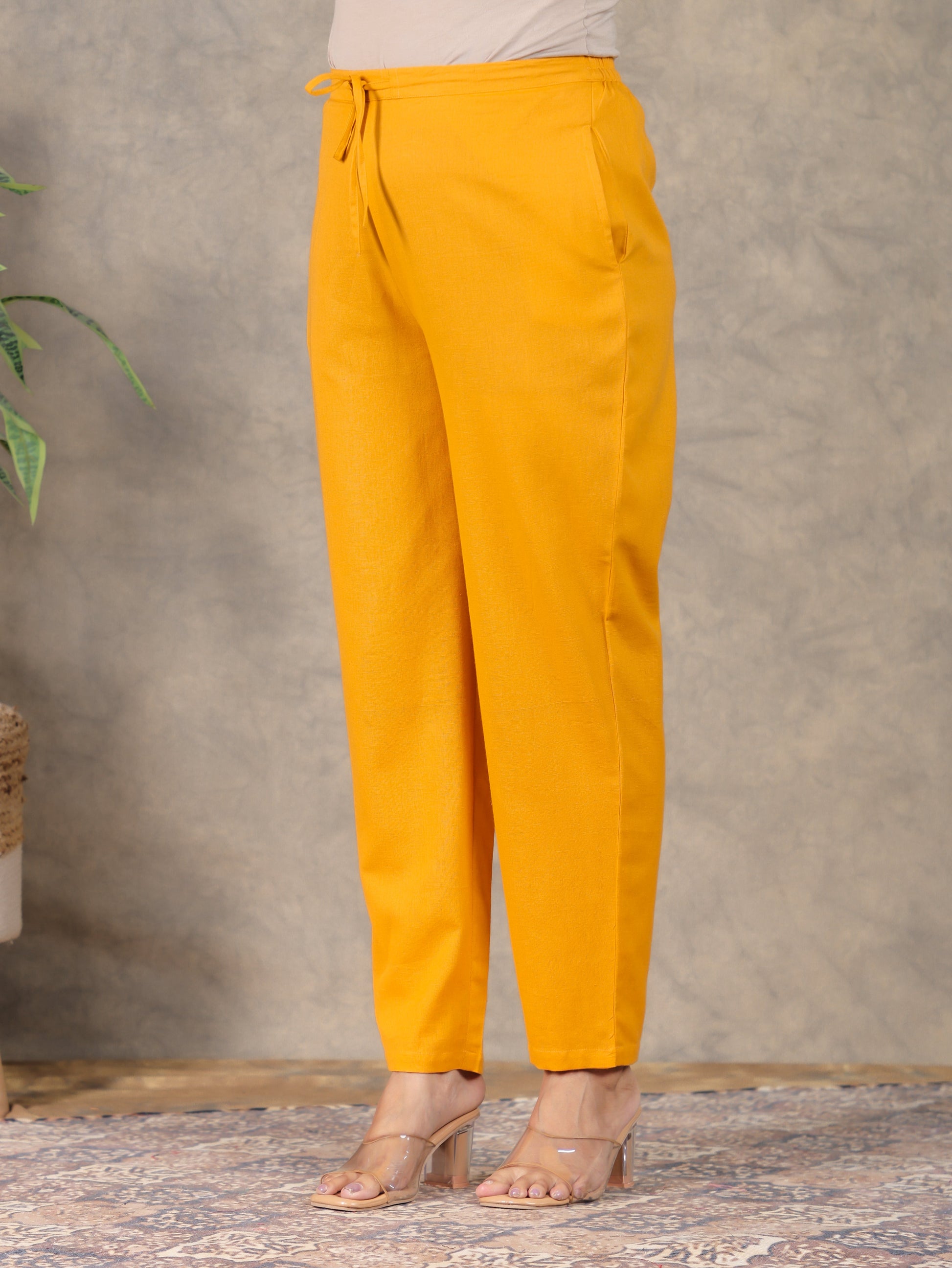 These Yellow trouser crafted from breathable Linen Cotton combine comfort and style. The Solid pattern adds a modern twist, while pockets make them practical for daily wear. Ideal for casual outings or workdays, they pair effortlessly with kurtas, tops, or tunics. Keep them looking fresh with minimal care and enjoy their all-day ease.