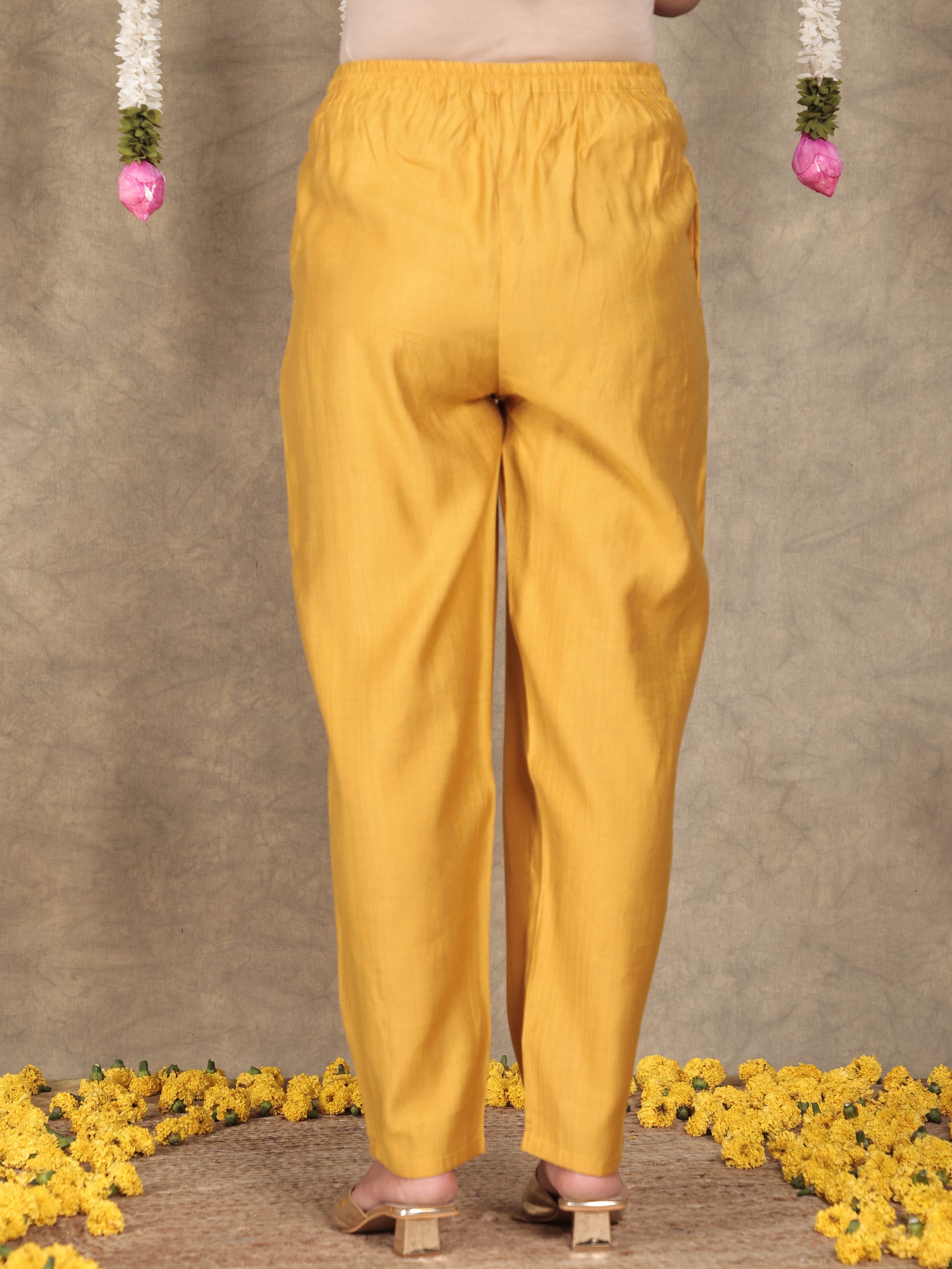 Upgrade your wardrobe with these Yellow bottoms made from lightweight Vertigan. The Solid accents bring subtle charm, while pockets make them practical for all-day wear. Perfect for pairing with ethnic kurtas or western blouses, these bottoms are a go-to choice for comfort and style. Easy care ensures they stay fresh season after season.