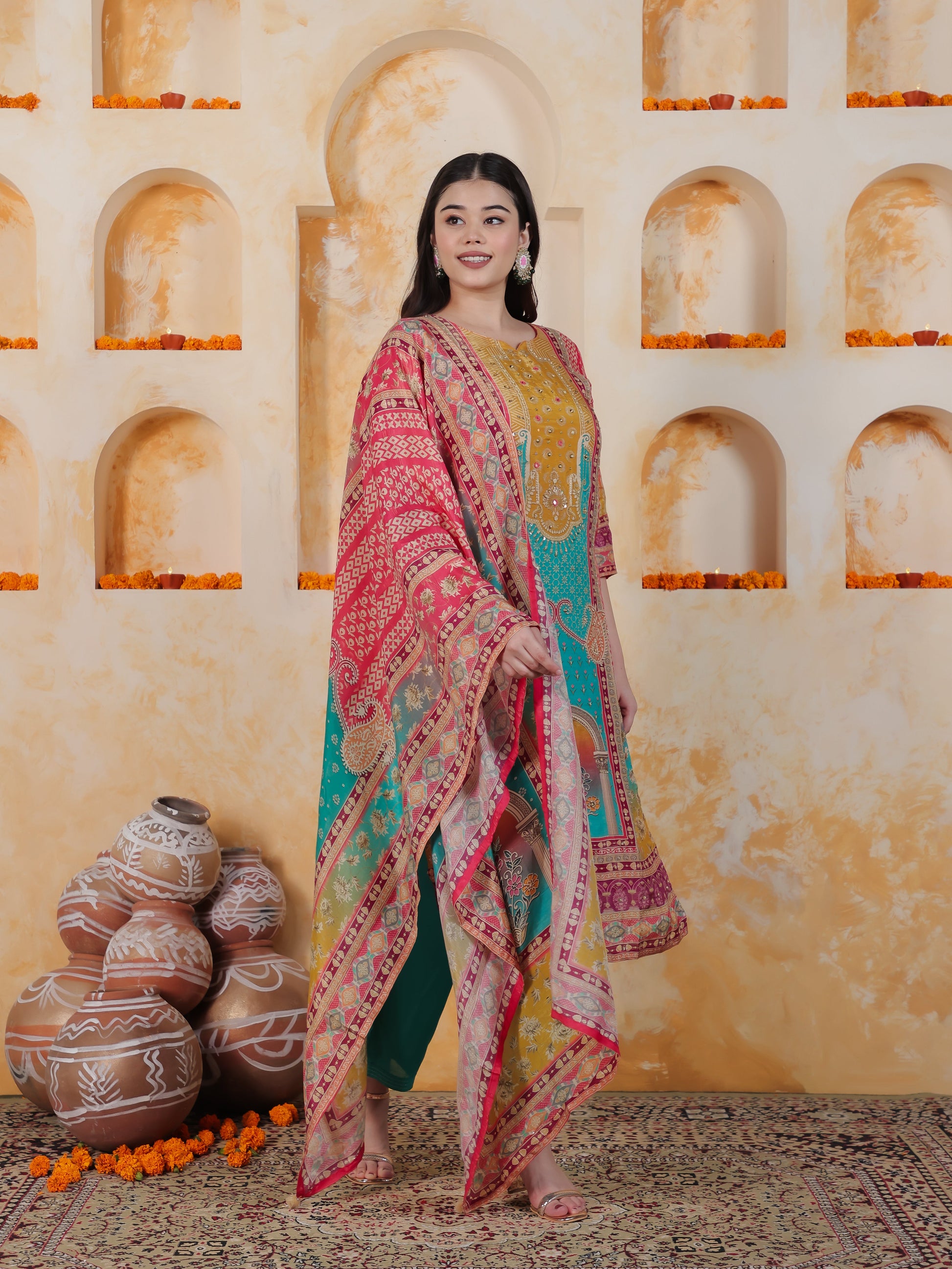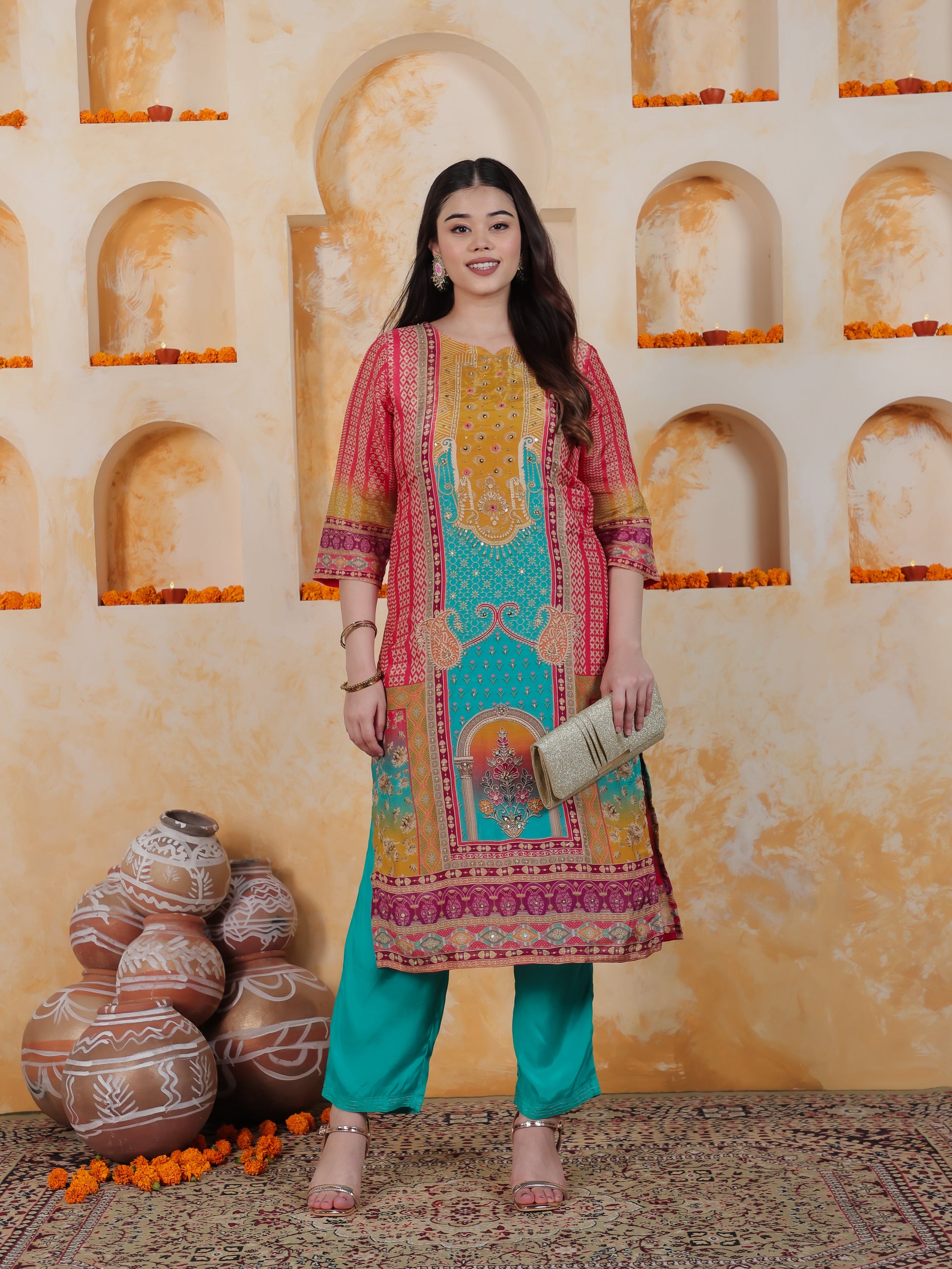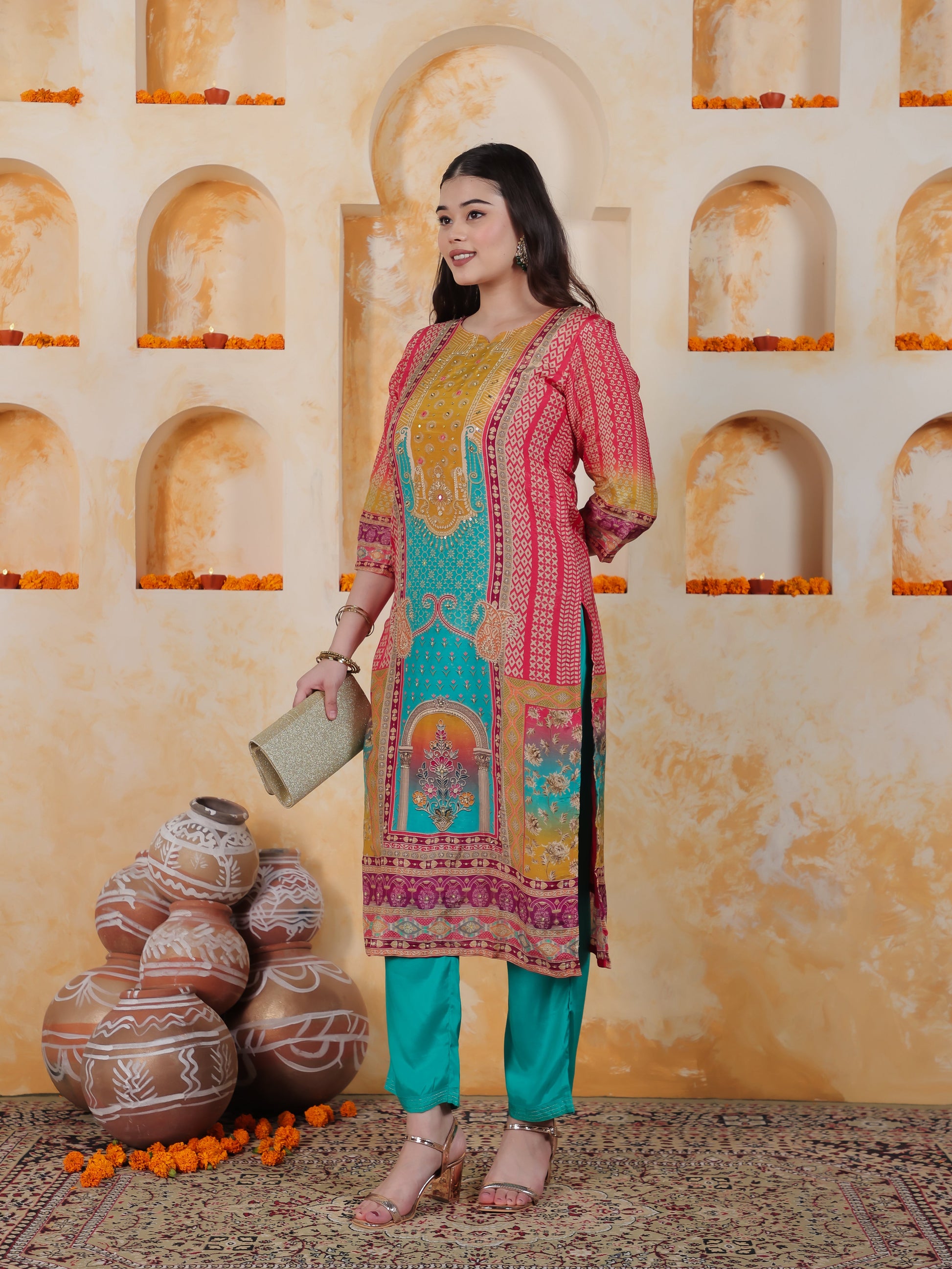 Mirror Work Multi Coloured Placement Print Satin Straight Kurta