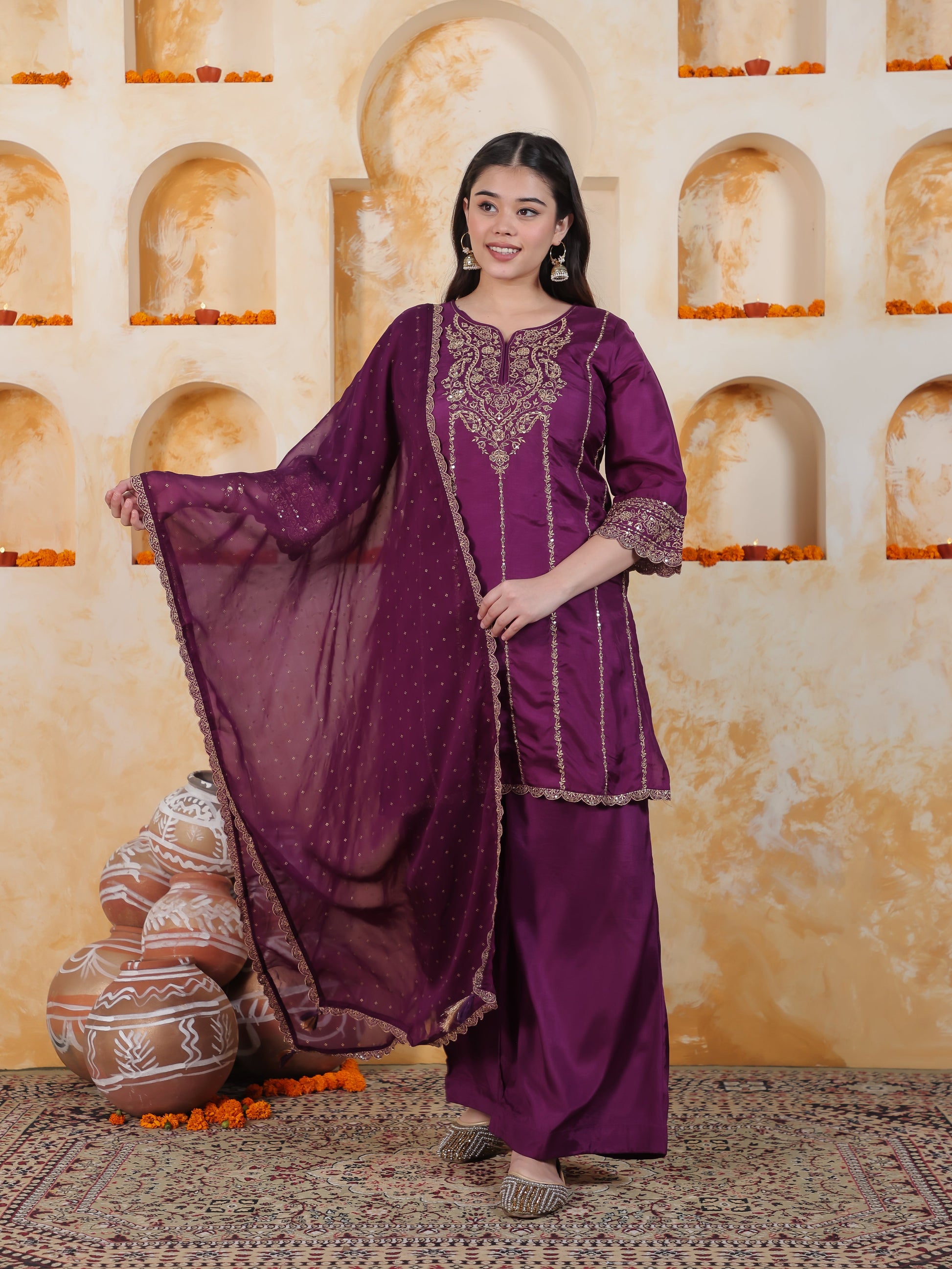 Zari Wine Solid Roman silk A-line Kurta