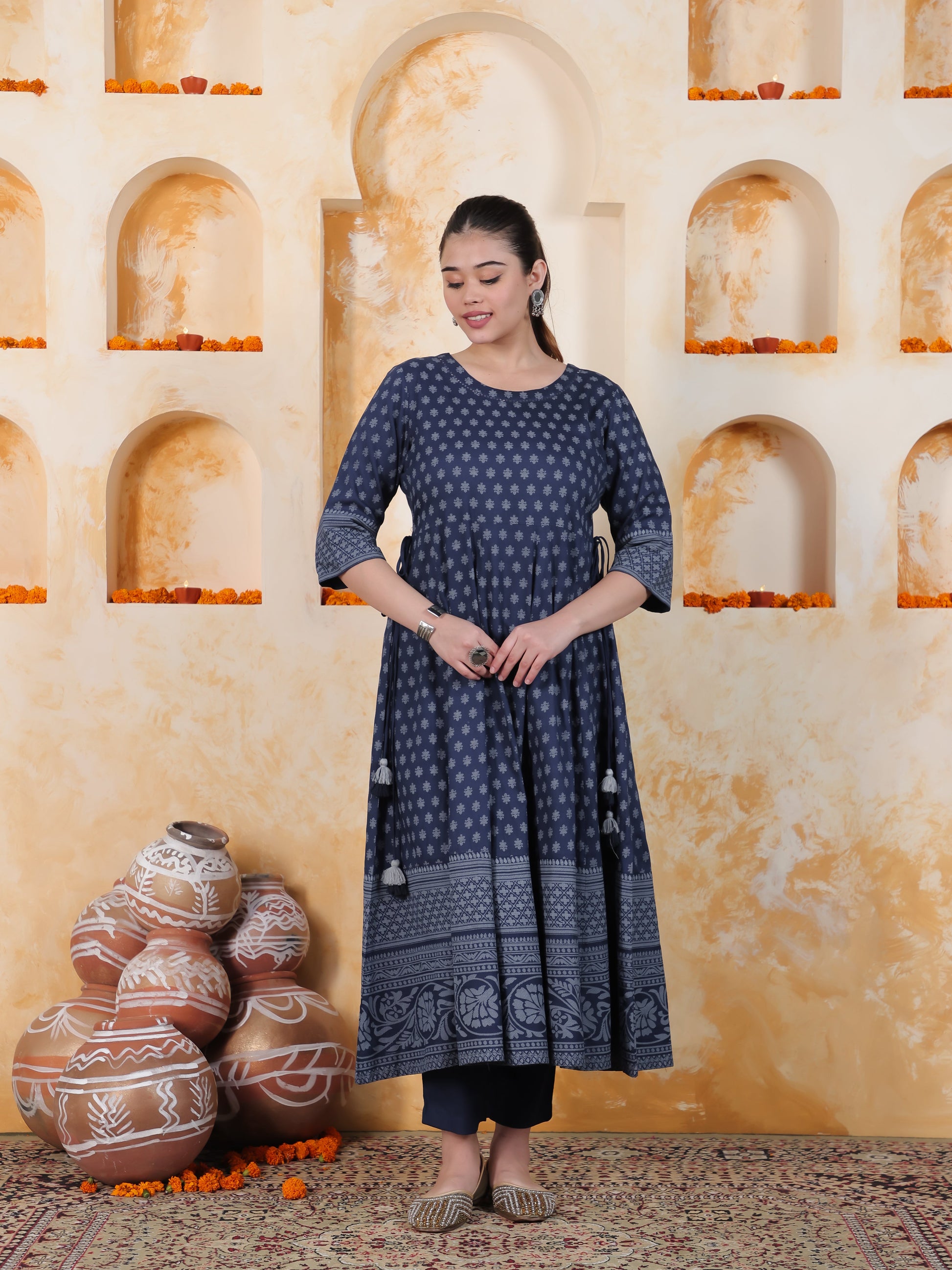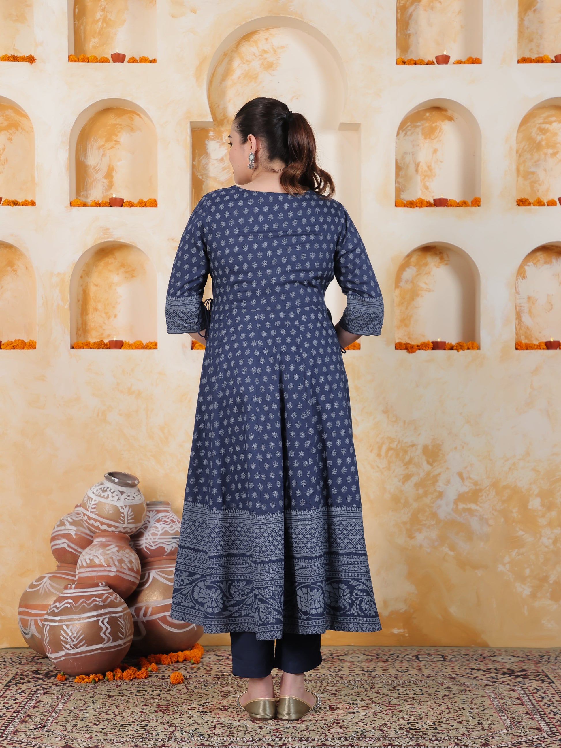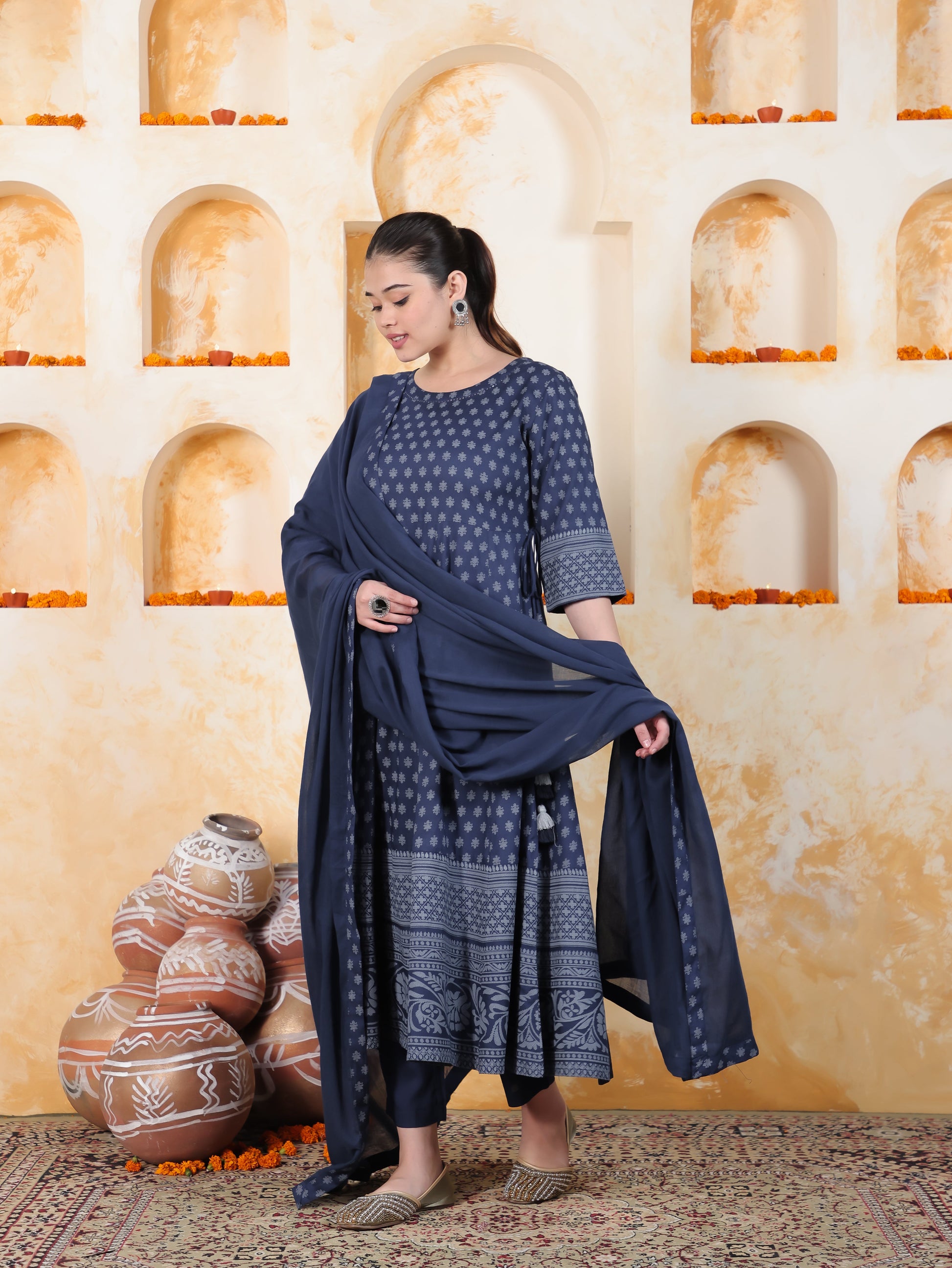 Kaantha Navy Blue Foil Viscose Kalidar Kurta