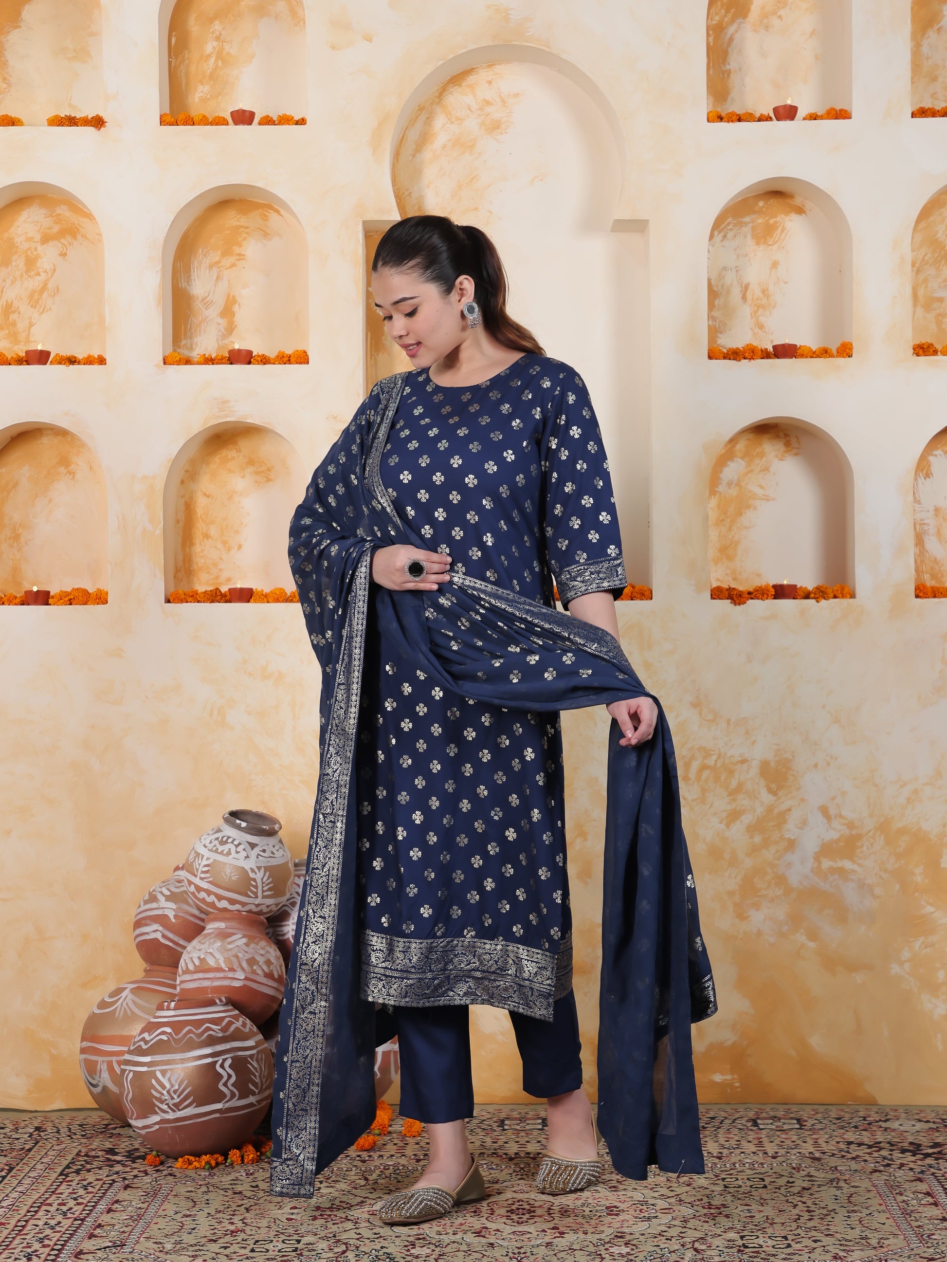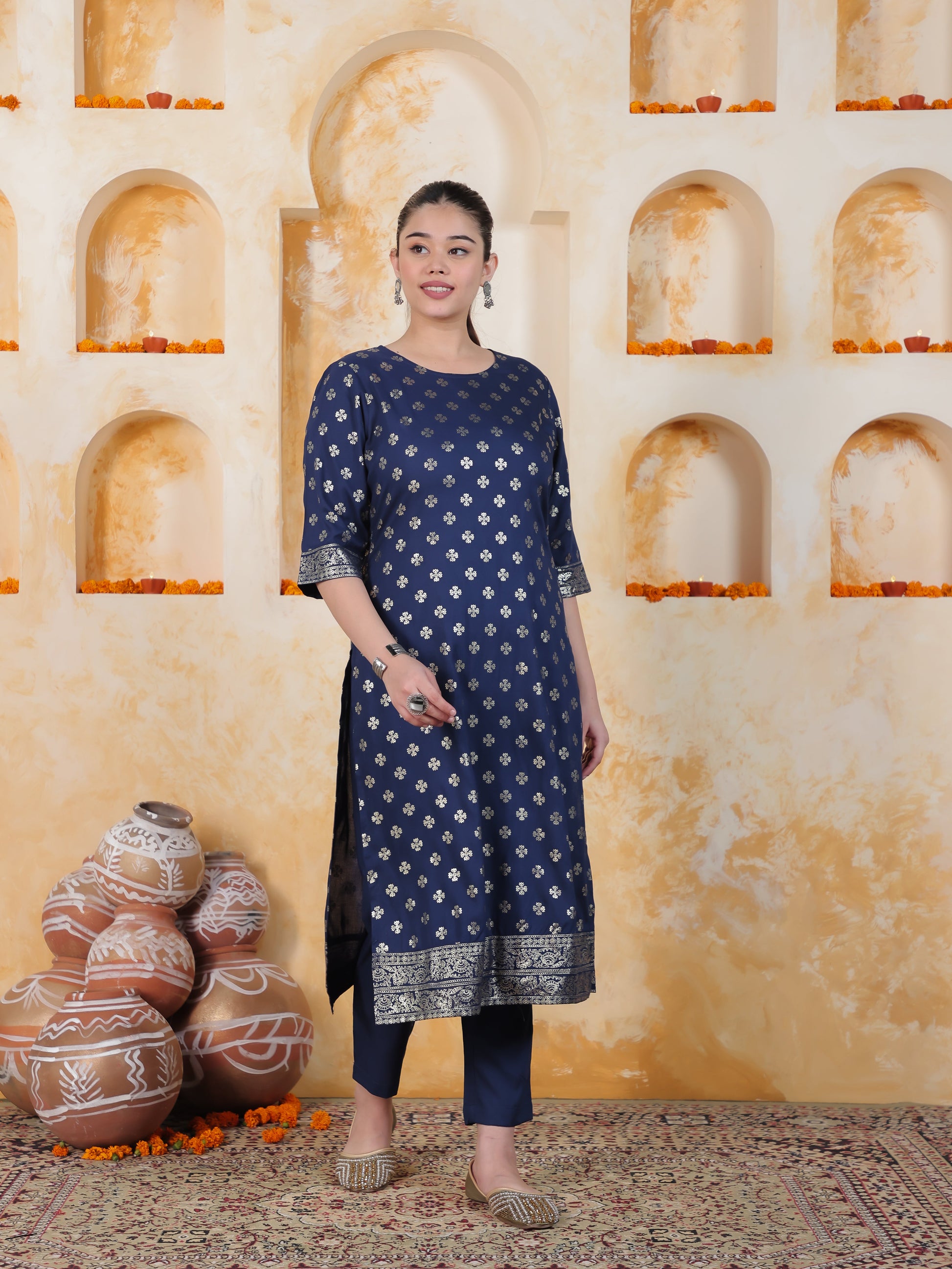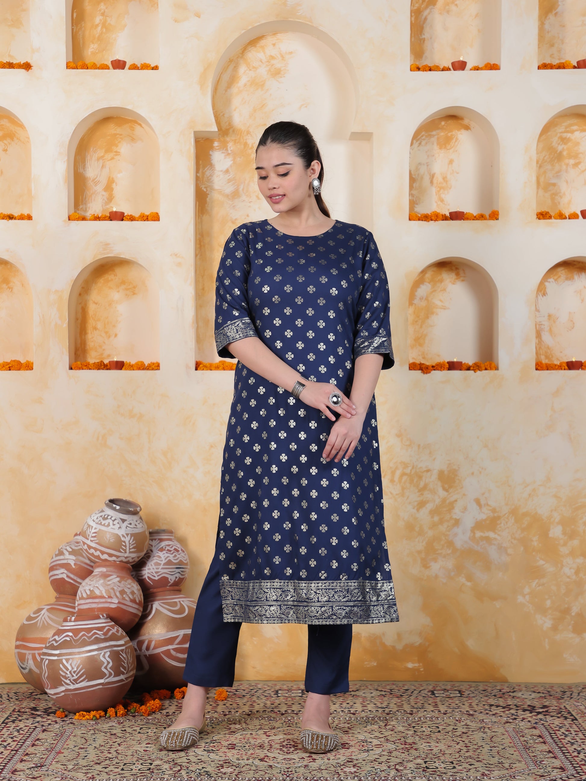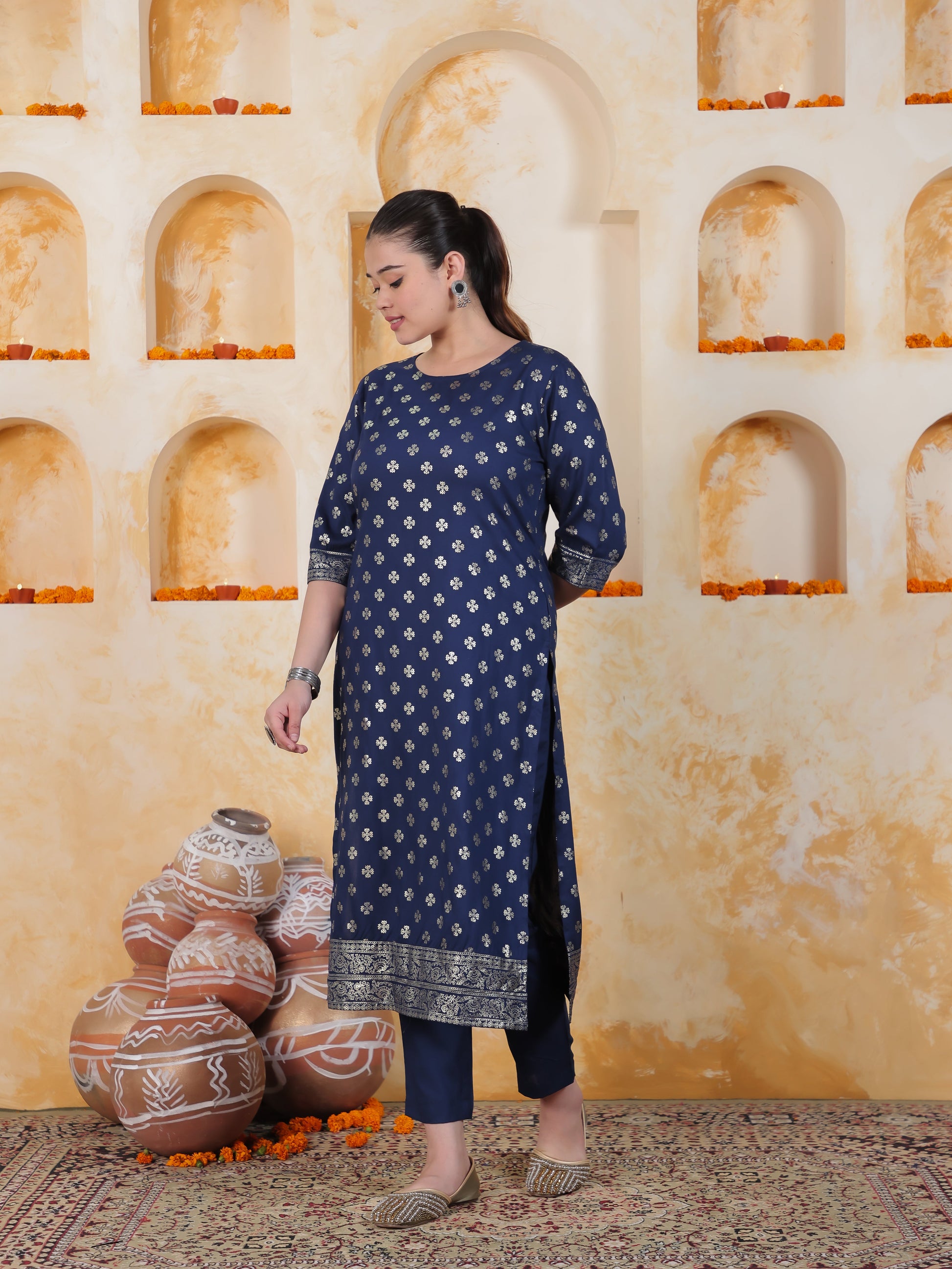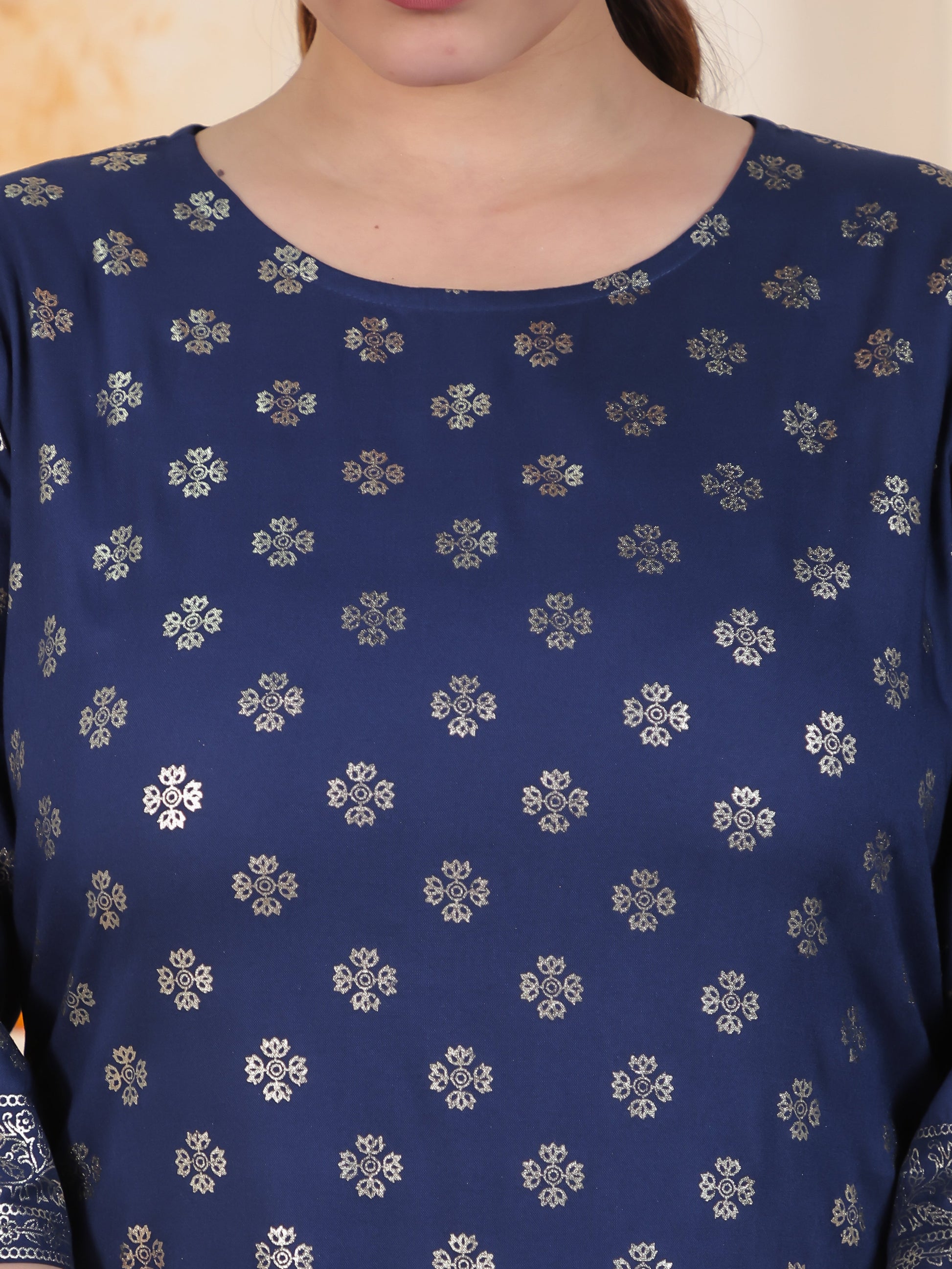 Navy Blue Foil Roman silk Straight Kurta