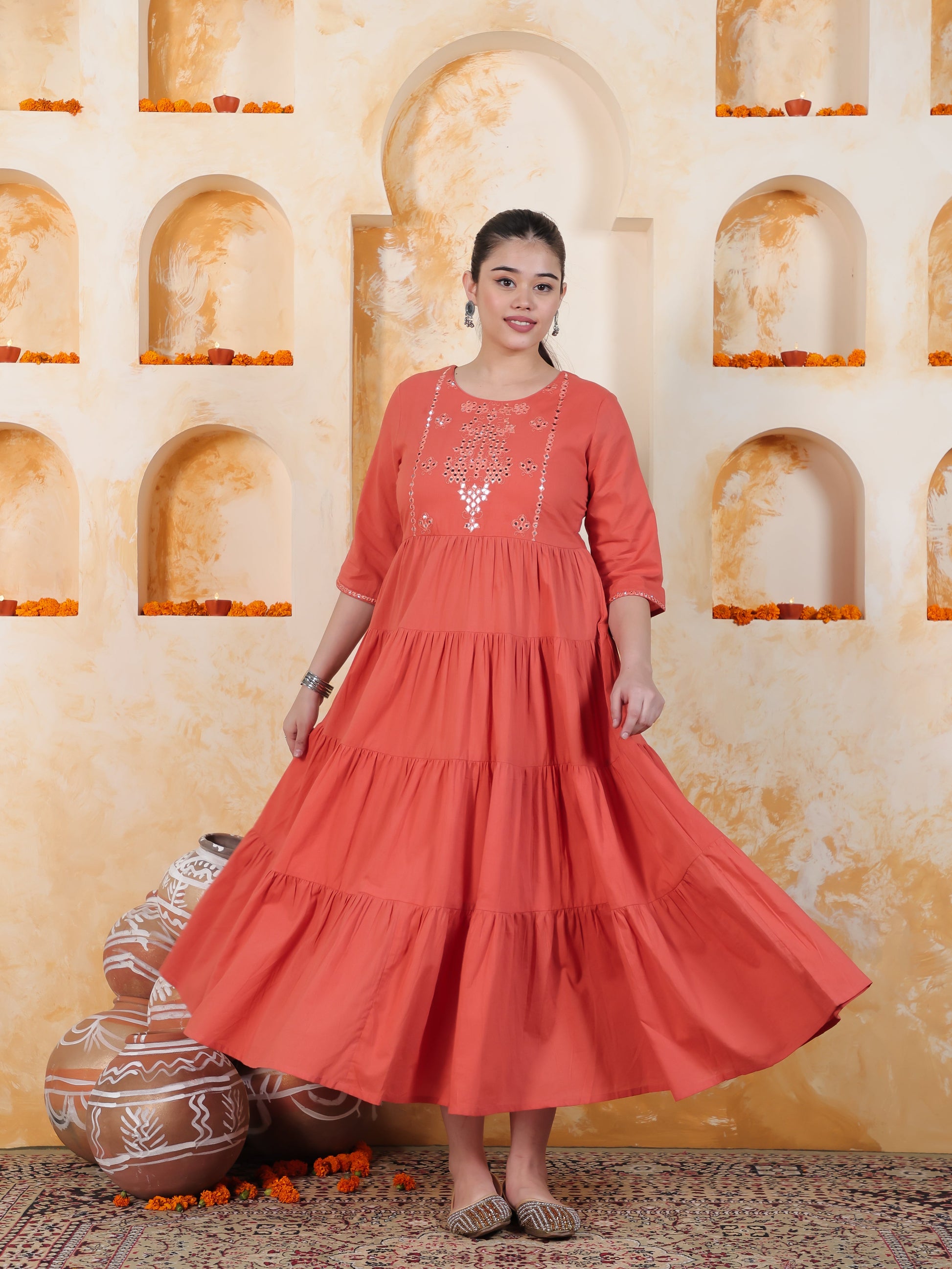 Mirror Work Brown Solid Viscose Tiered Kurta